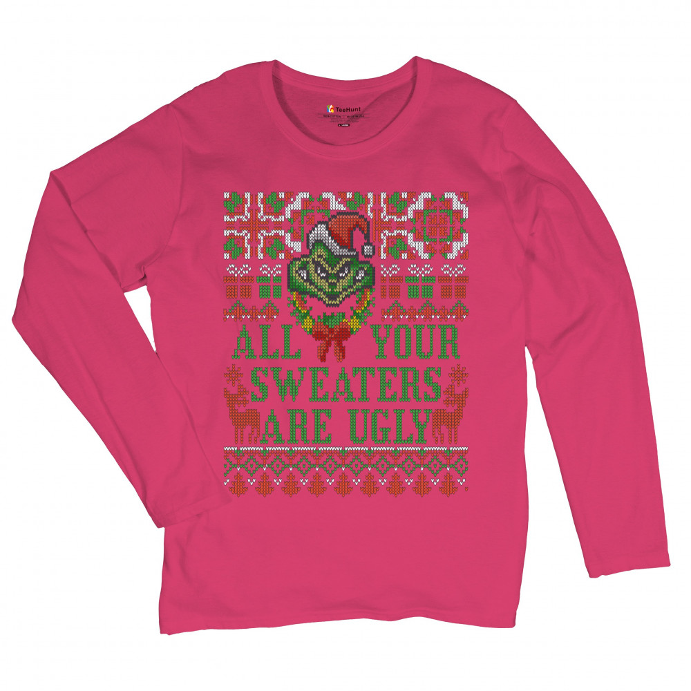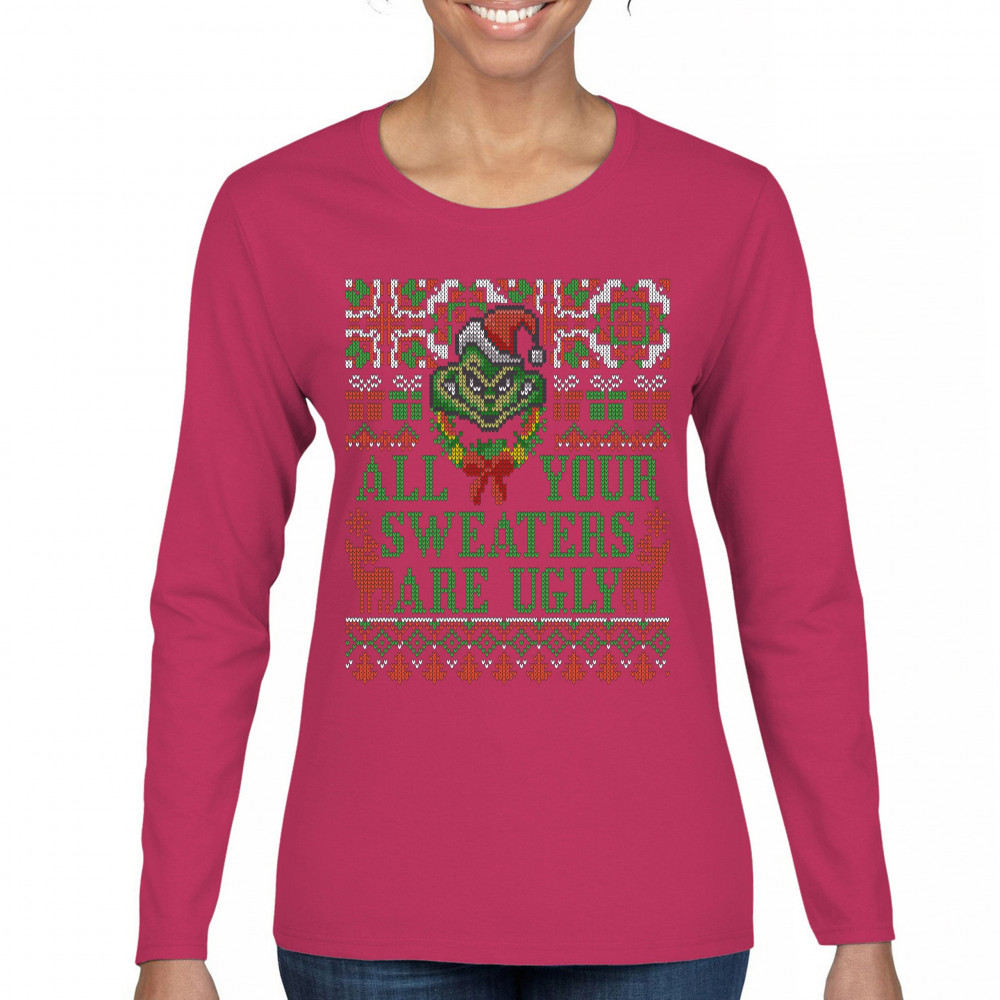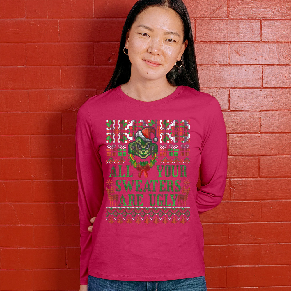 ALL YOUR SWEATERS ARE UGLY women's long sleeve t-shirt merry christmas rudolph pink