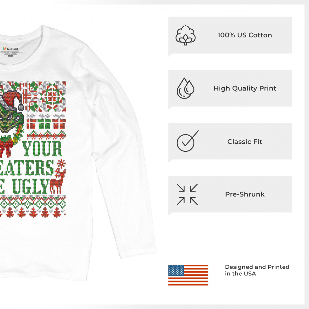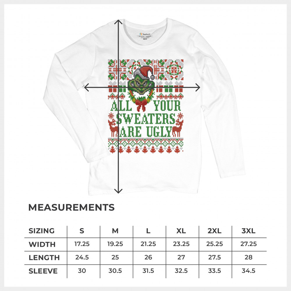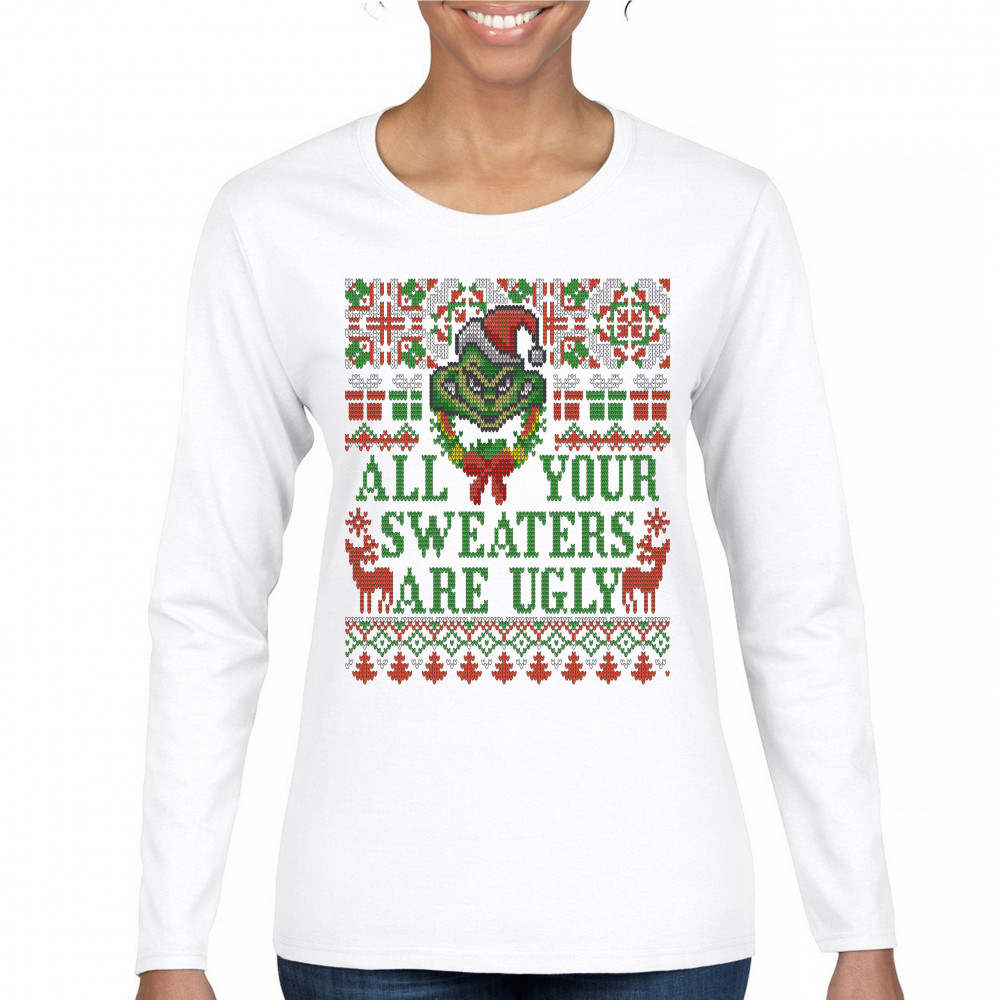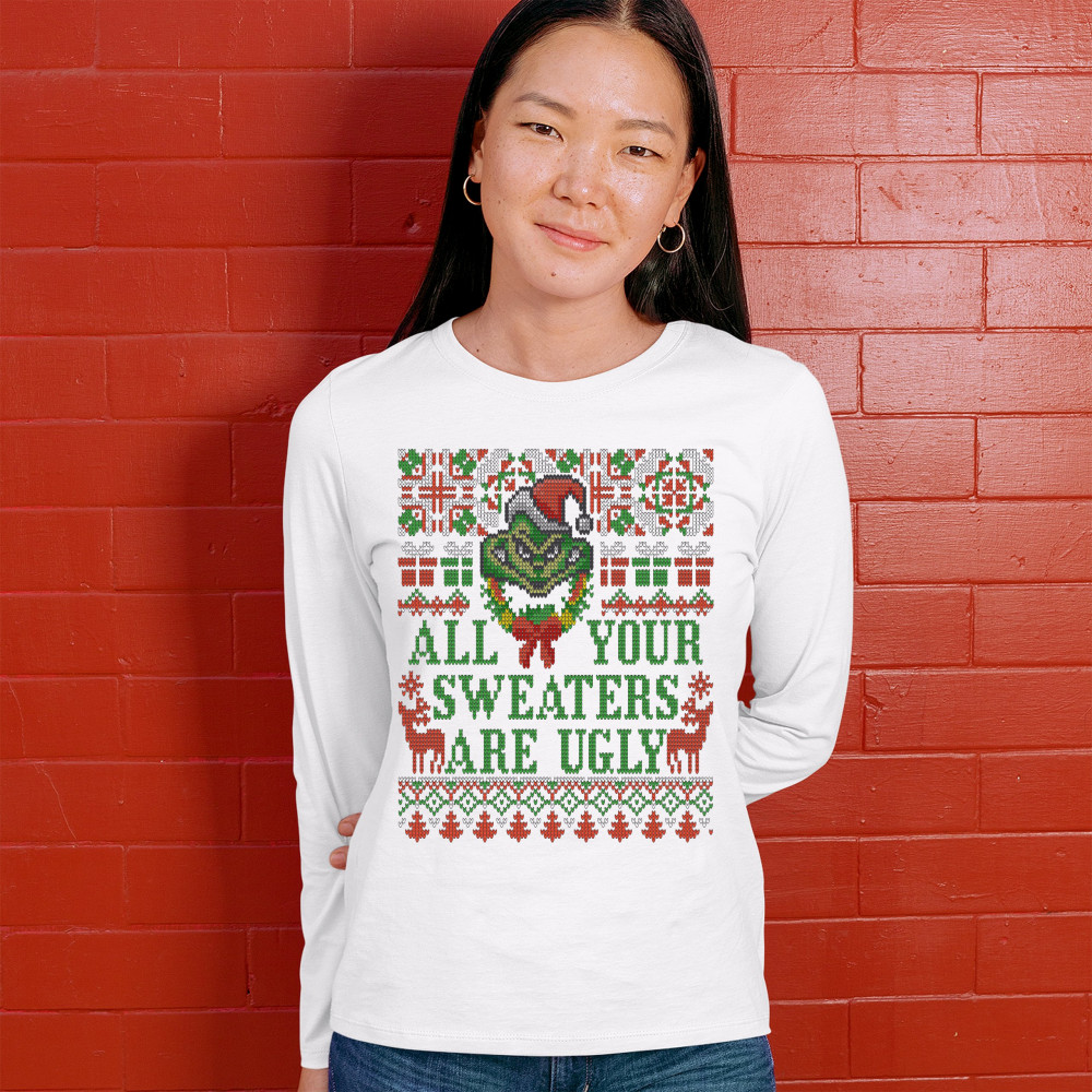 A funny print saying: "All Your Sweaters Are Ugly" and featuring a green goblin's face and two reindeers. The print is decorated as an ugly sweater. Amazing choice to make people smile and spread positive vibes on Christmas Eve.