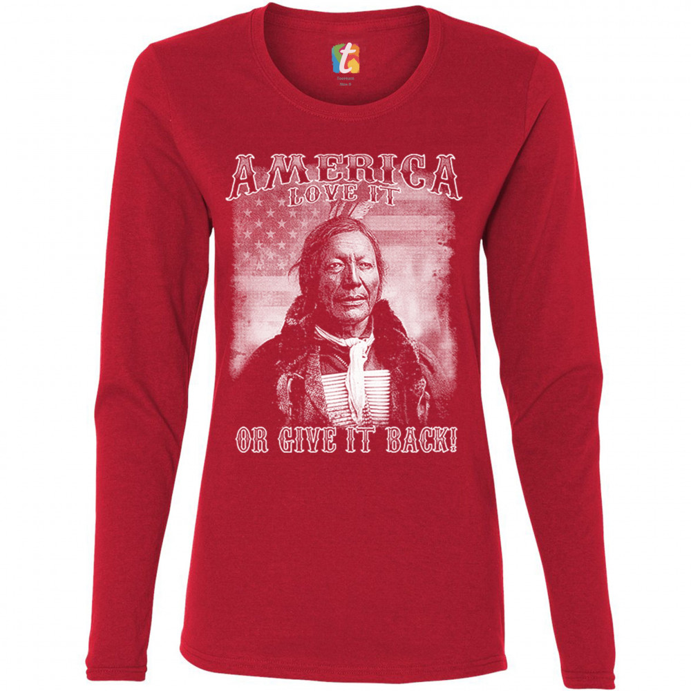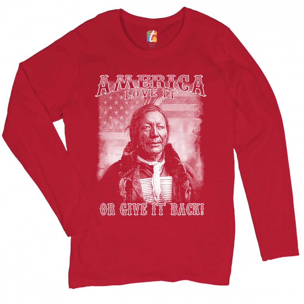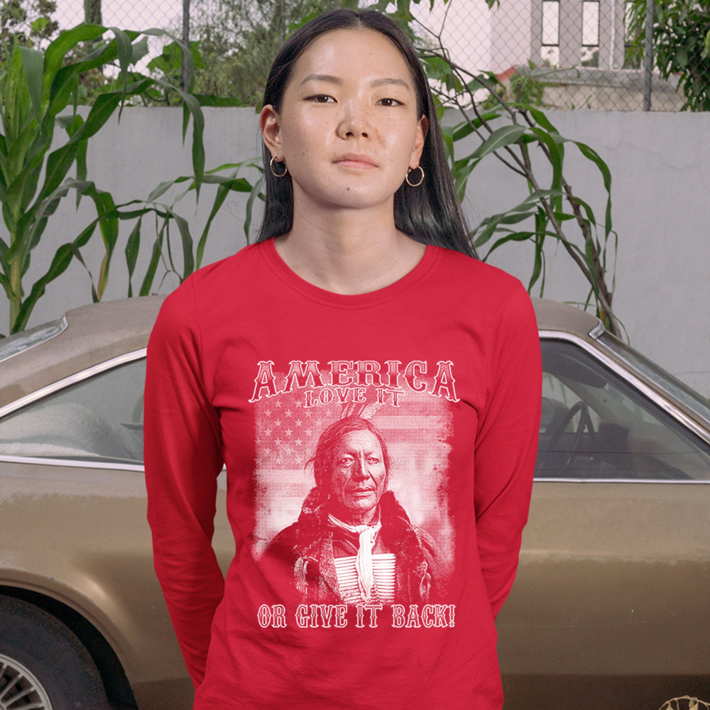 AMERICA LOVE IT OR GIVE IT BACK women's long sleeve t-shirt indigenous chief red