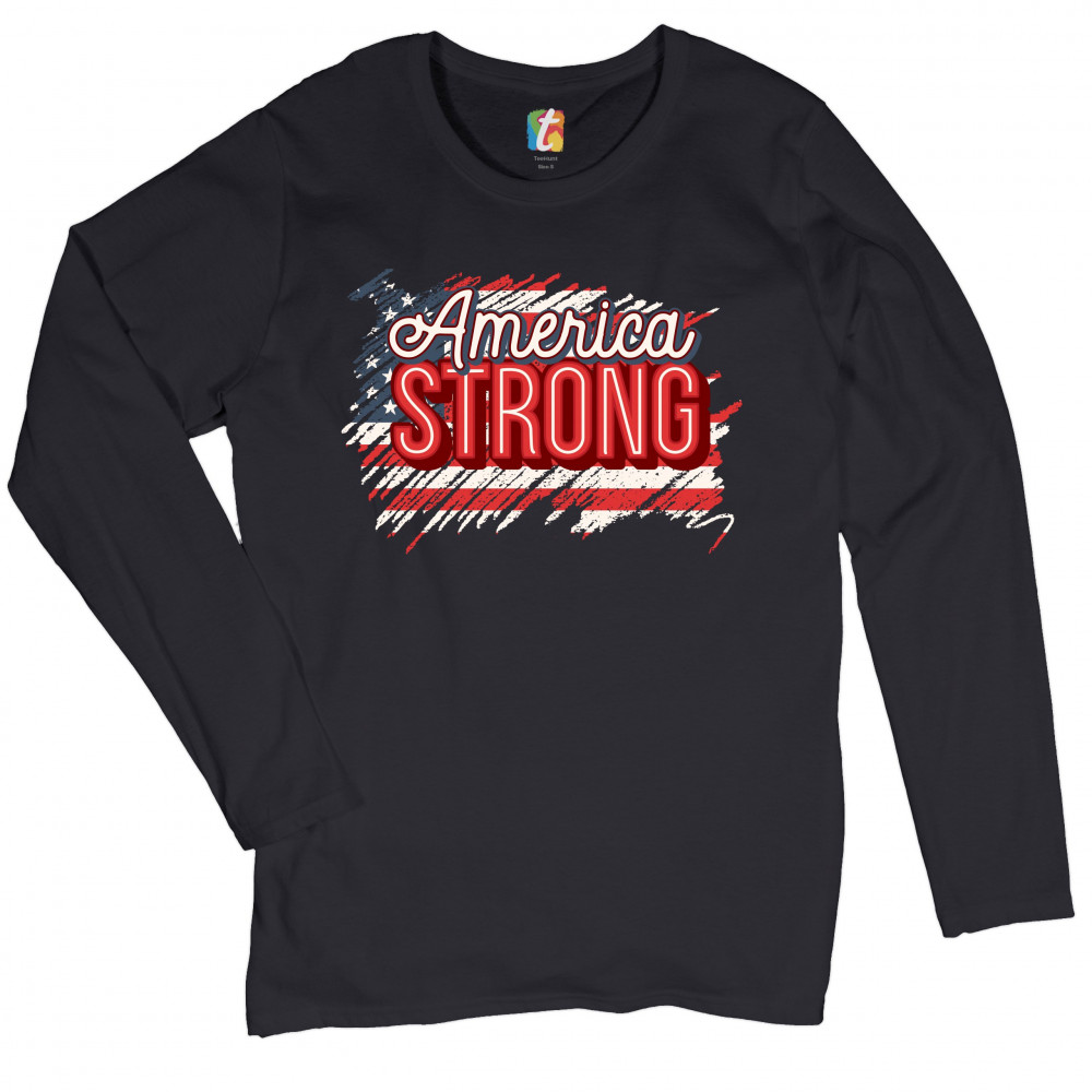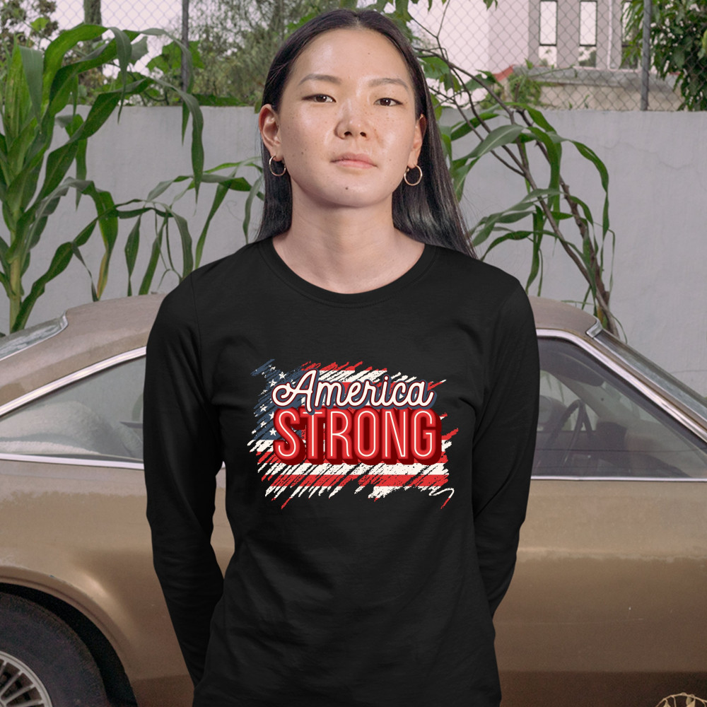 A patriotic print featuring a distressed American Flag in the background and the words "America Strong" in front of it. Great choice to wear on Independence Day or any other patriotic holiday.
