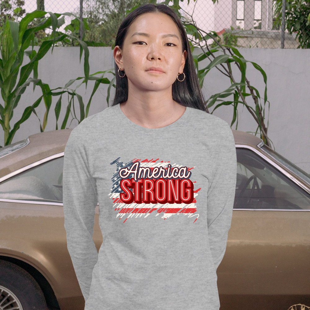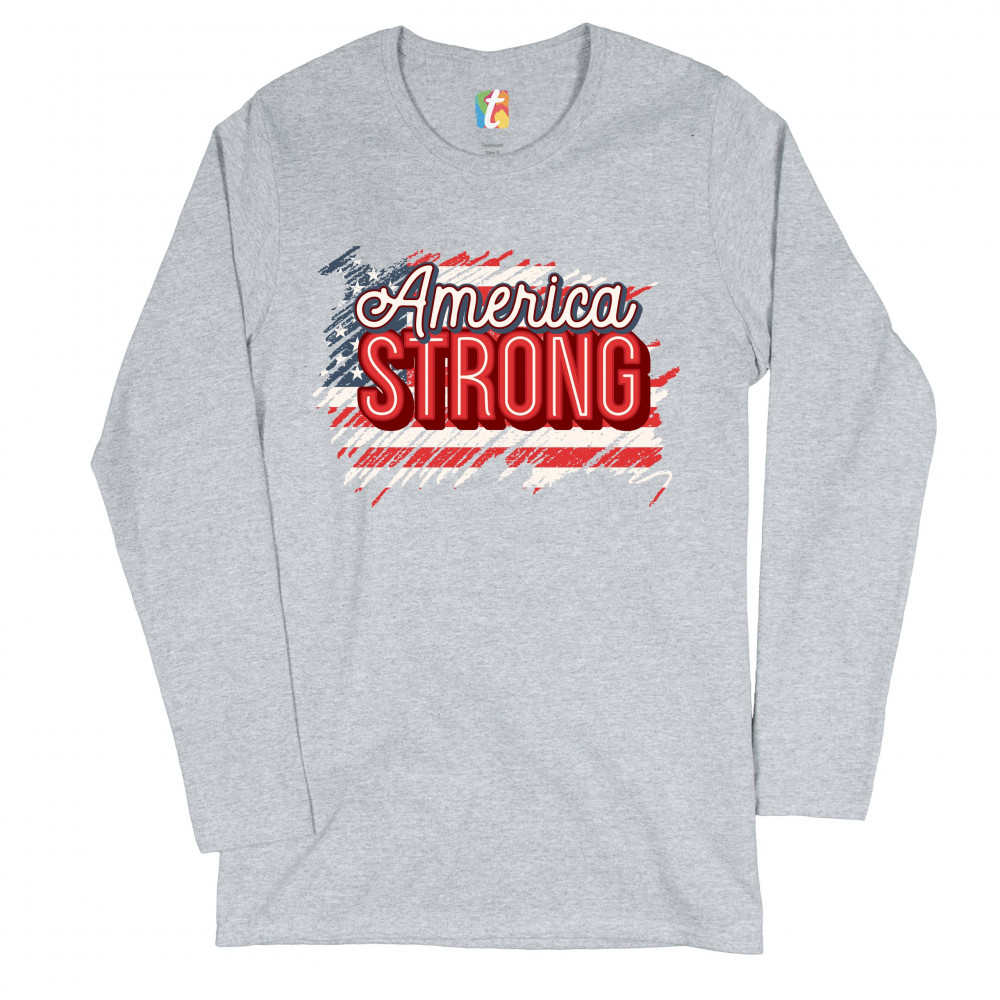 A patriotic print featuring a distressed American Flag in the background and the words "America Strong" in front of it. Great choice to wear on Independence Day or any other patriotic holiday.