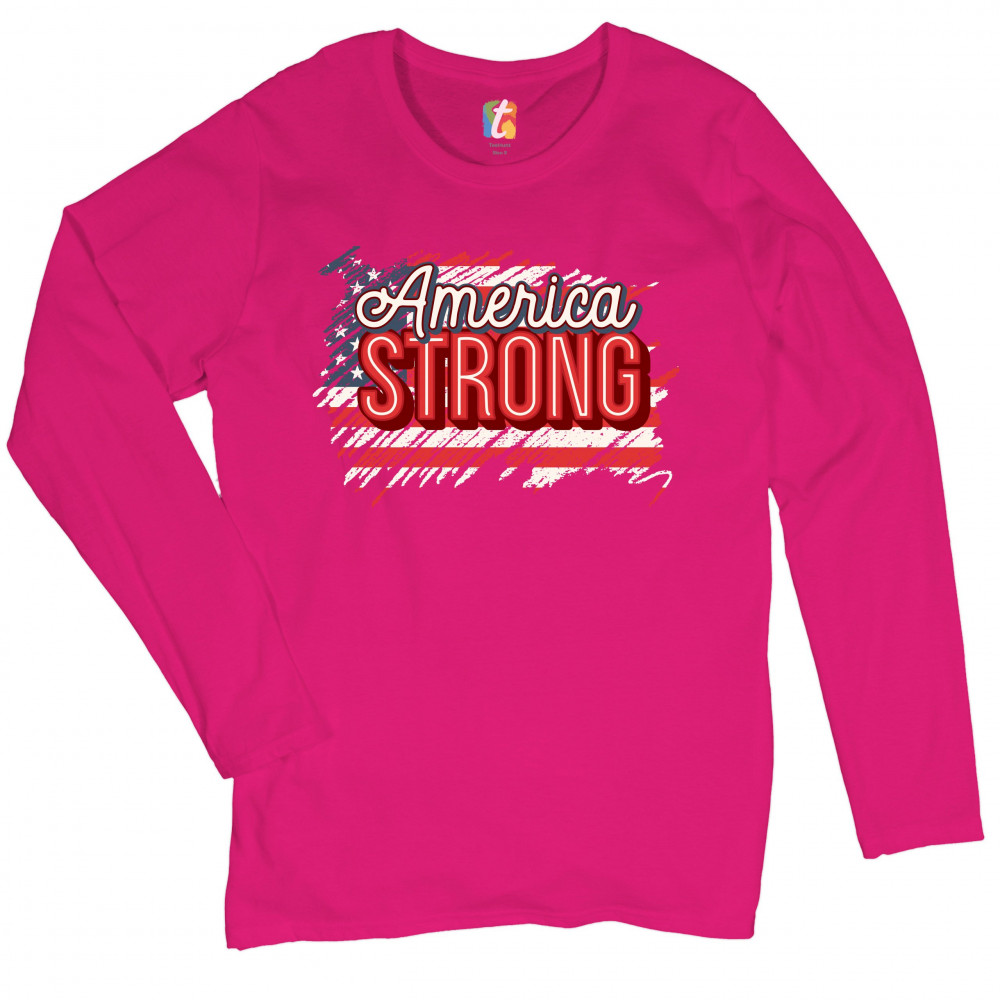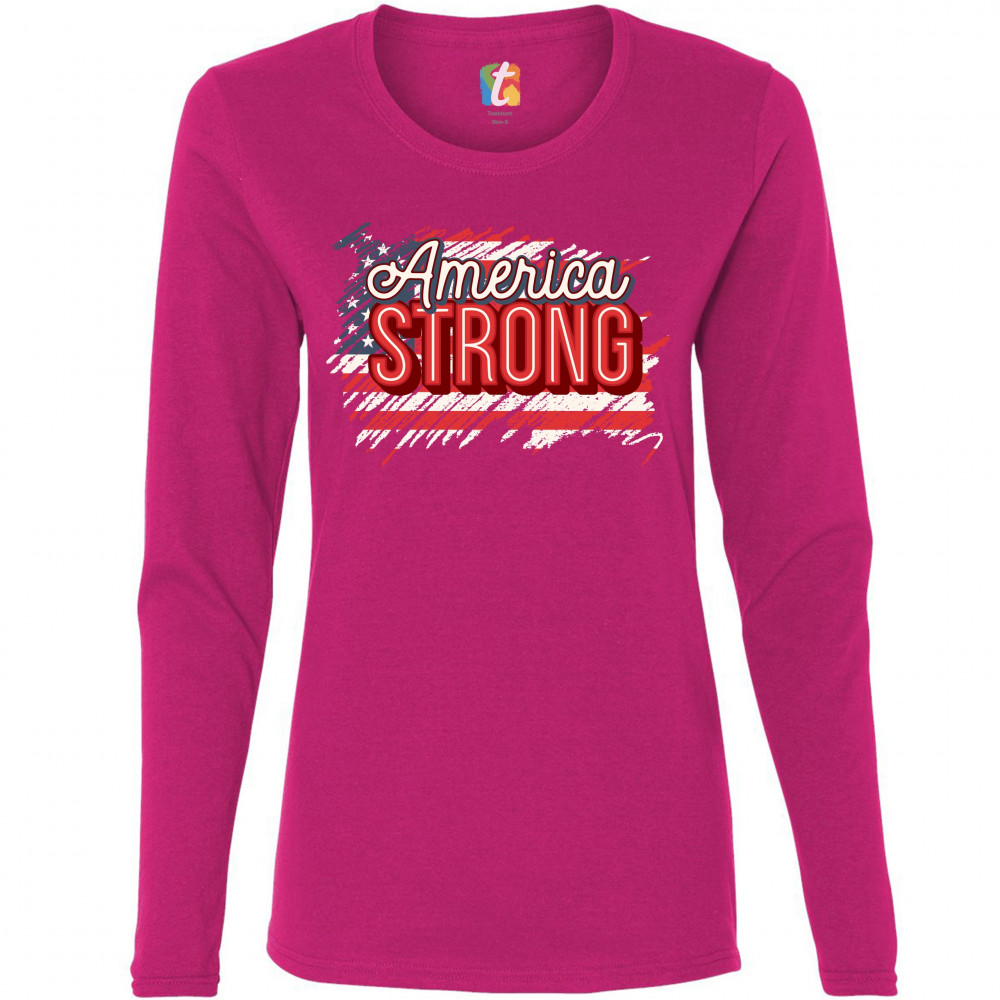 AMERICA STRONG women's long sleeve t-shirt distressed american flag 4th of july pink