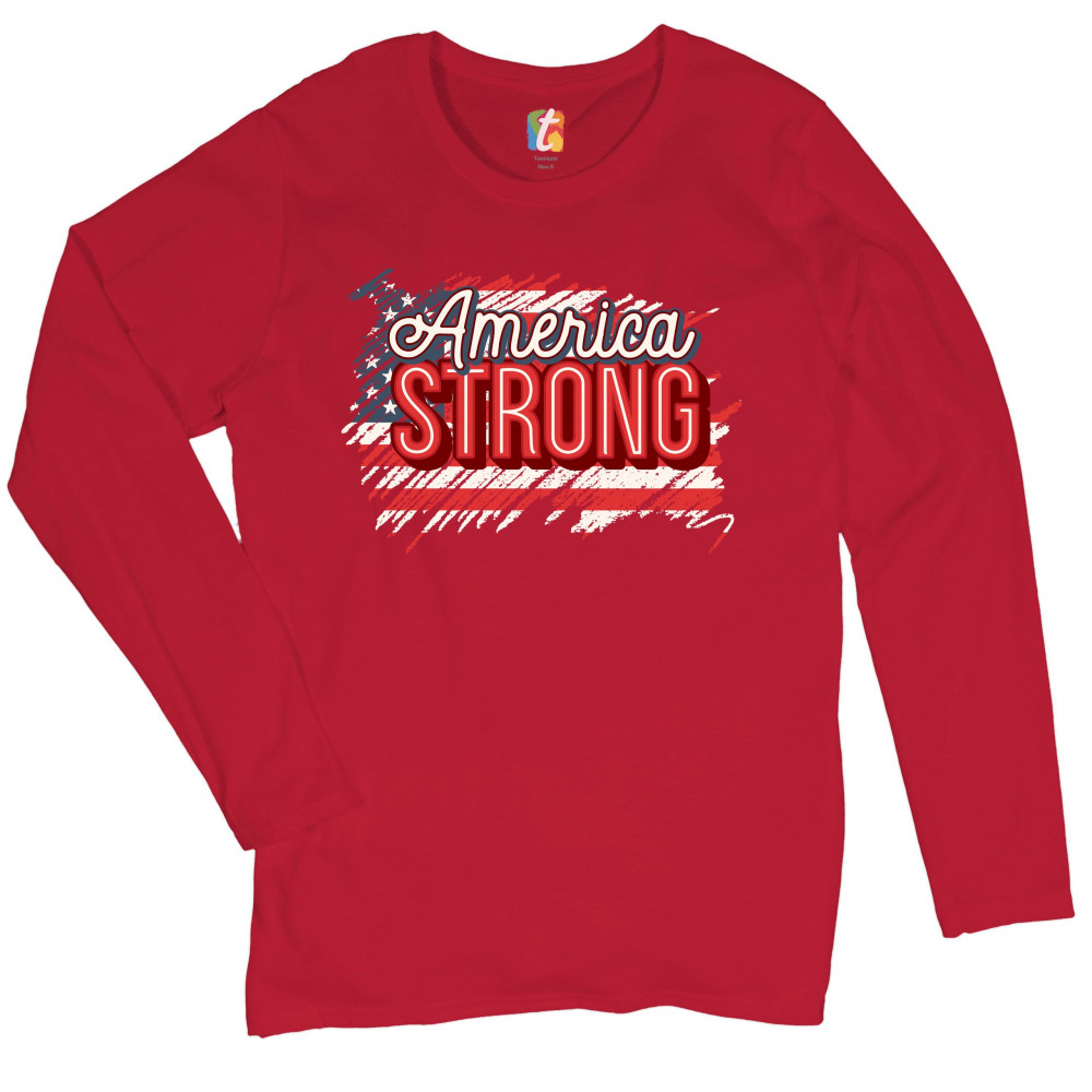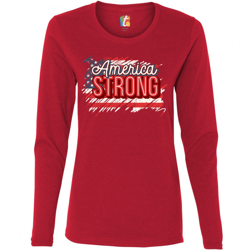 AMERICA STRONG women's long sleeve t-shirt distressed american flag 4th of july red