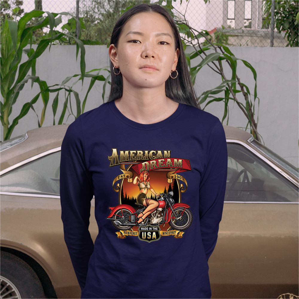 A print featuring a sexy pin up girl sitting on a vintage motorcycle. The print says: "American Dream est. 1903". In the bottom there is a sign saying: "made in the USA". To the left and right of it "Milwaukee Wisconsin" is written on a stripe. Great choice for any motorcycle enthusiast.