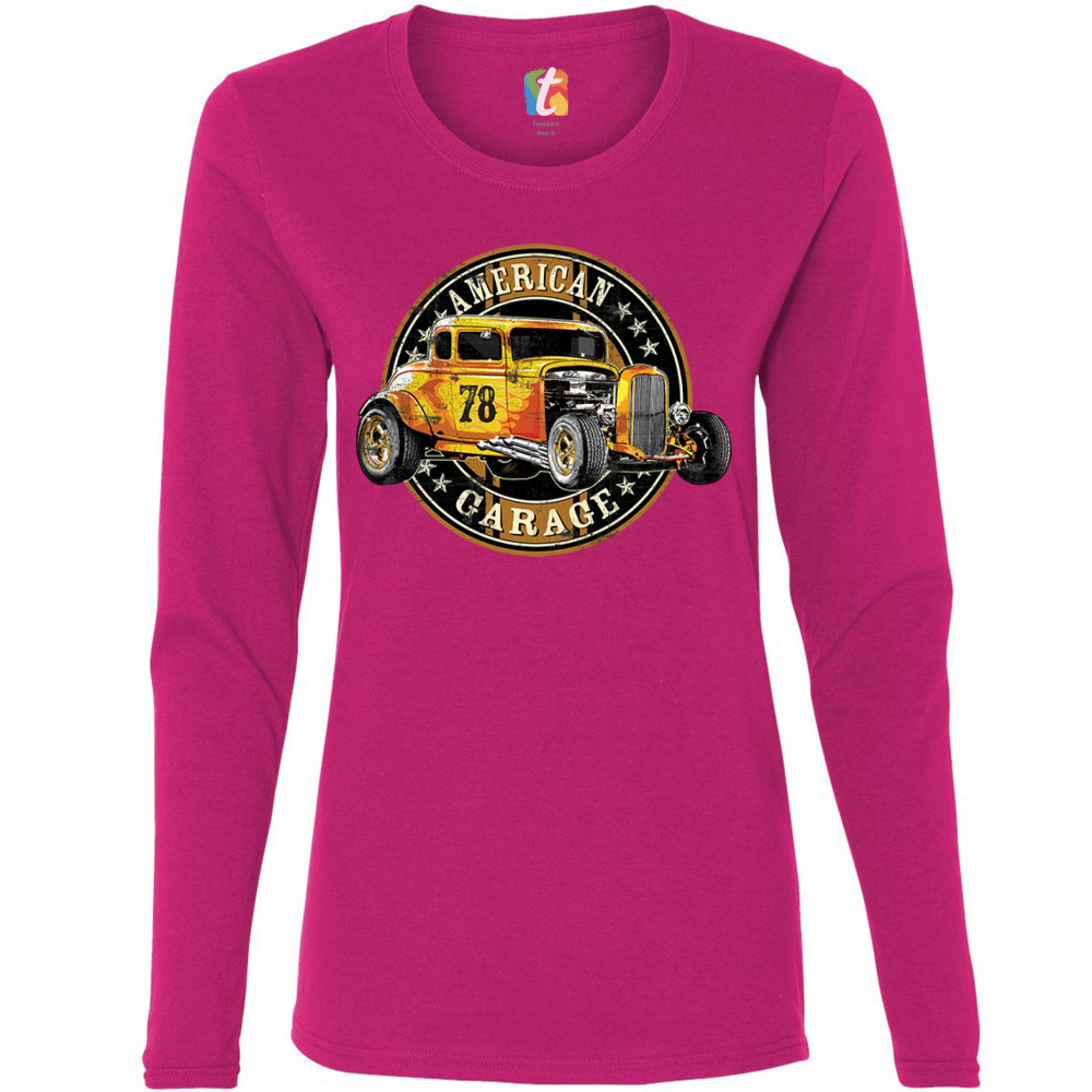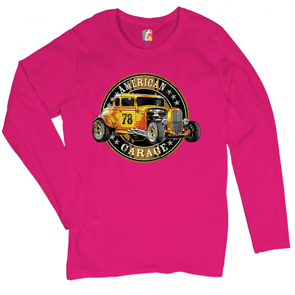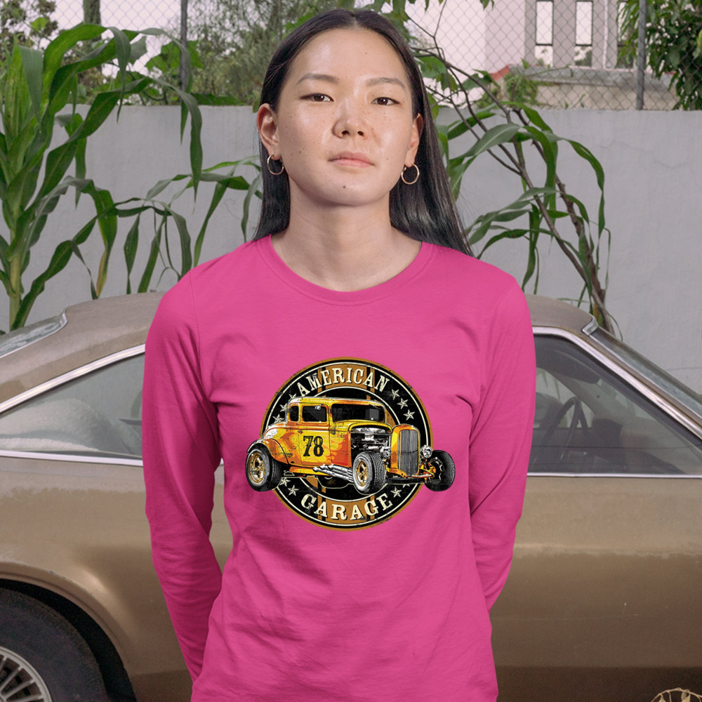 AMERICAN GARAGE women's long sleeve t-shirt retro hot rod vintage muscle car pink