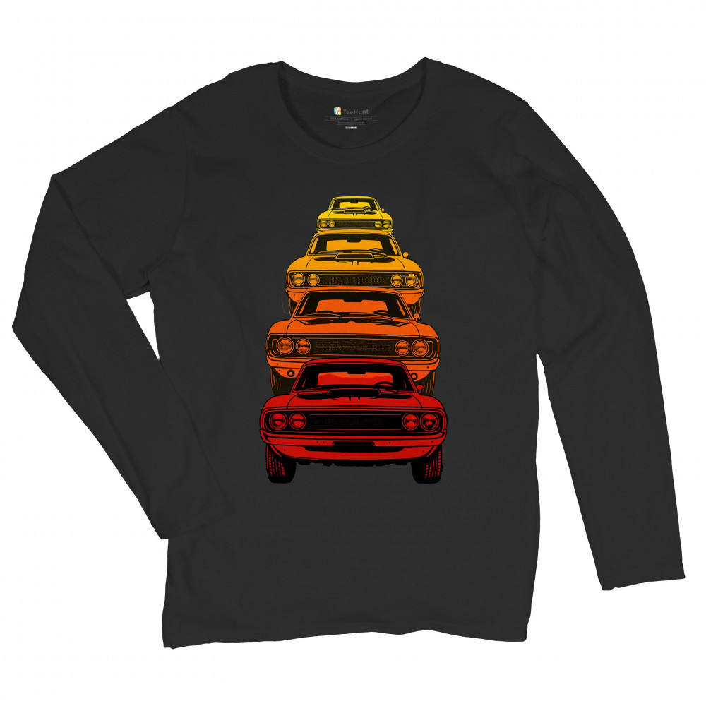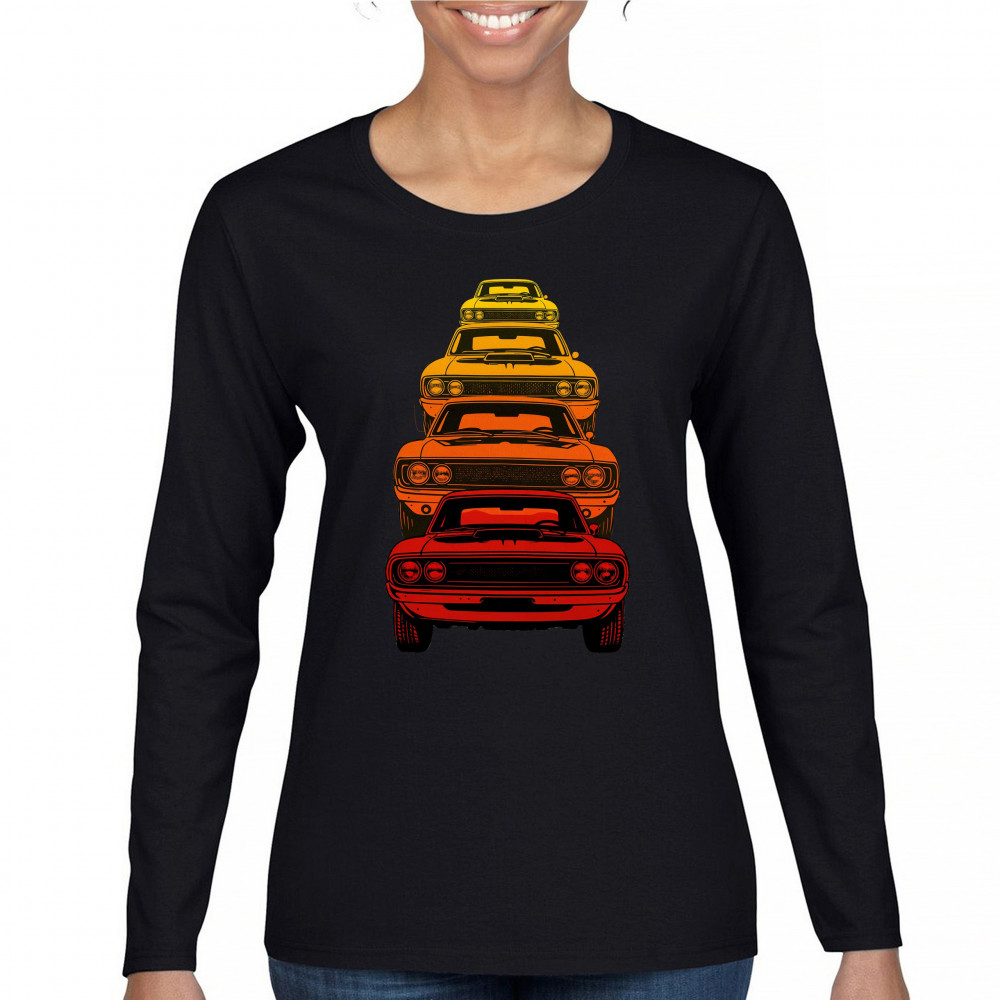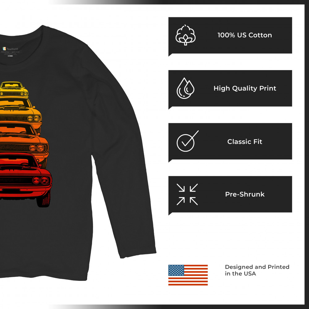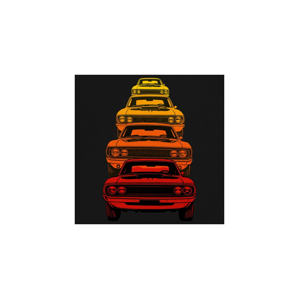 Celebrate horsepower heritage with this colorful lineup of classic muscle cars. Featuring a stacked gradient from red to yellow, this design brings bold retro attitude, V8 pride, and American torque to life. Perfect for collectors, gearheads, and fans of classic car power.