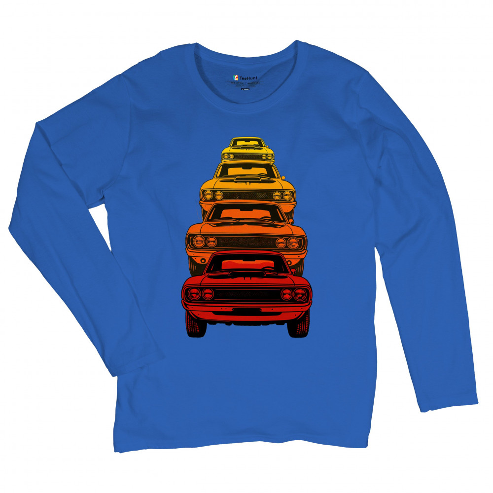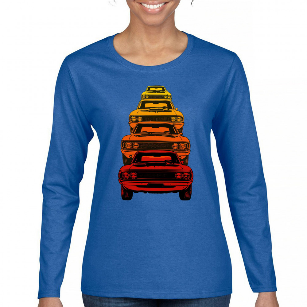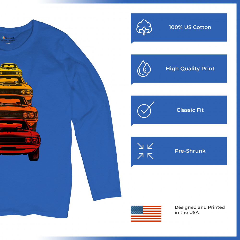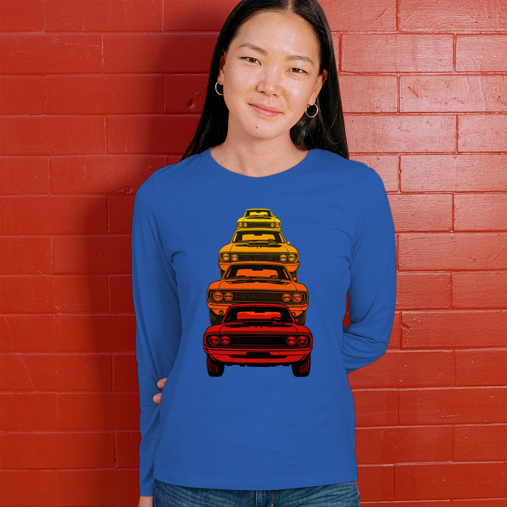 Celebrate horsepower heritage with this colorful lineup of classic muscle cars. Featuring a stacked gradient from red to yellow, this design brings bold retro attitude, V8 pride, and American torque to life. Perfect for collectors, gearheads, and fans of classic car power.