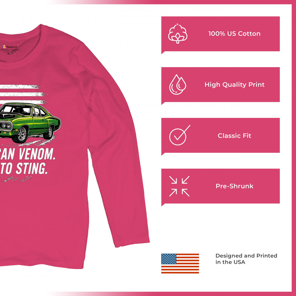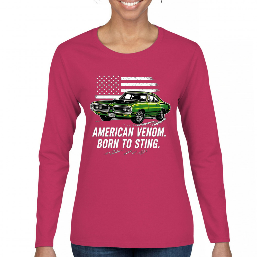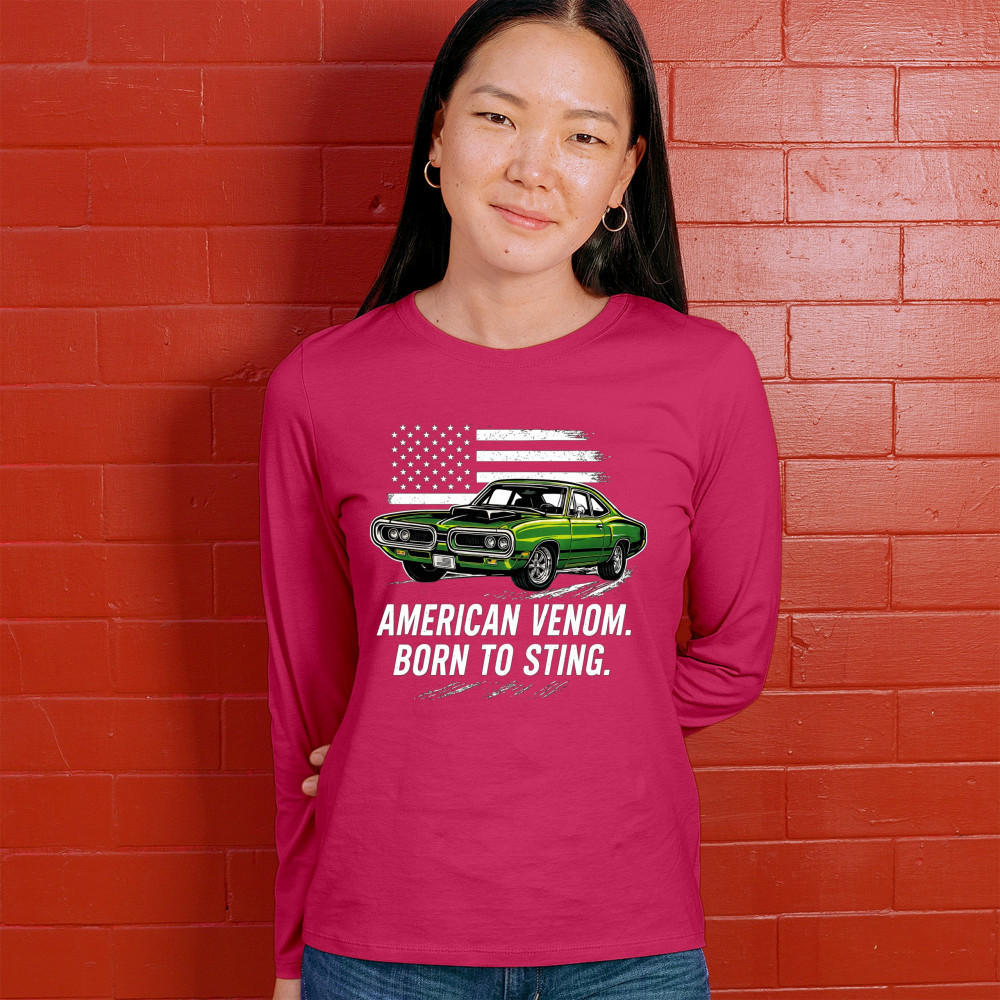 Inject venom into your street style with this bold green muscle car design. With “Born to Sting†power and a backdrop of American pride, this graphic is perfect for Scat fans, gearheads, and drivers who embrace speed, dominance, and the sound of true muscle. Rule car meets, rev battles, and highway runs with unmatched attitude.