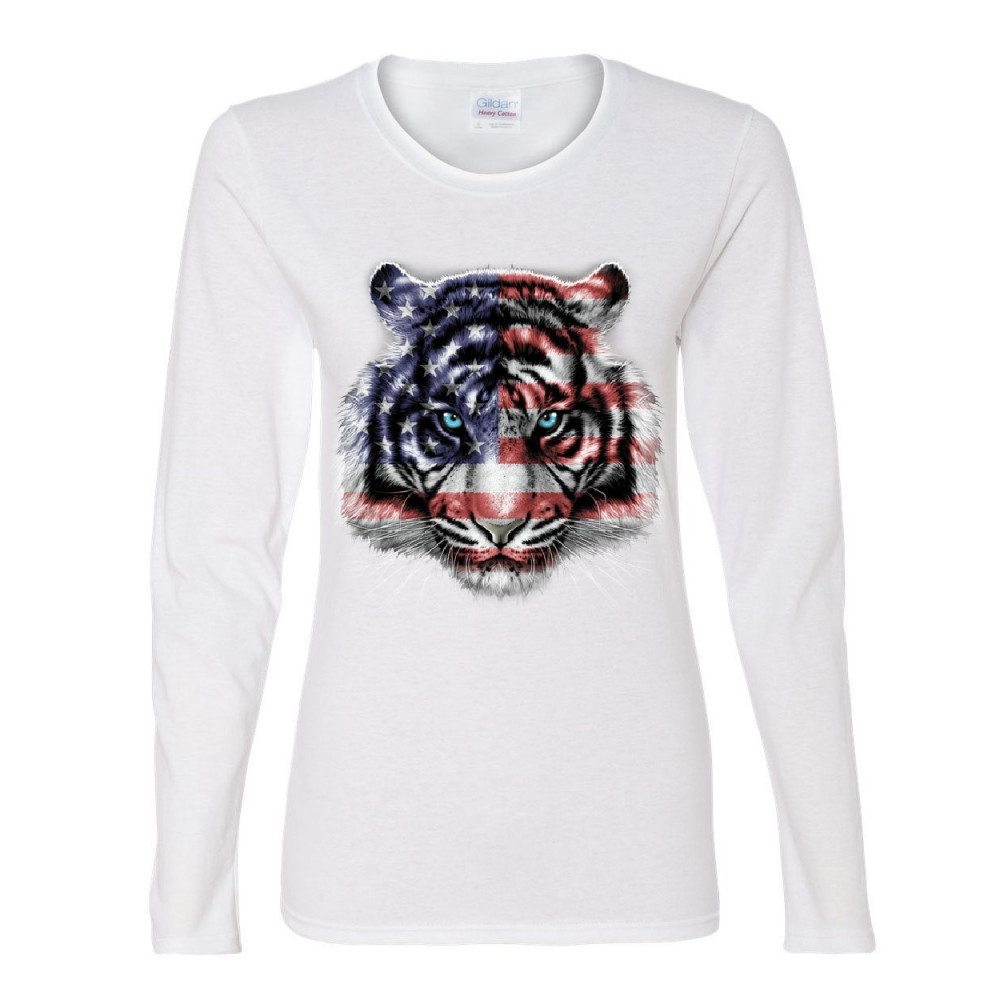 AMERICAN WHITE TIGER women's long sleeve tee stars and stripes wild cat nature white