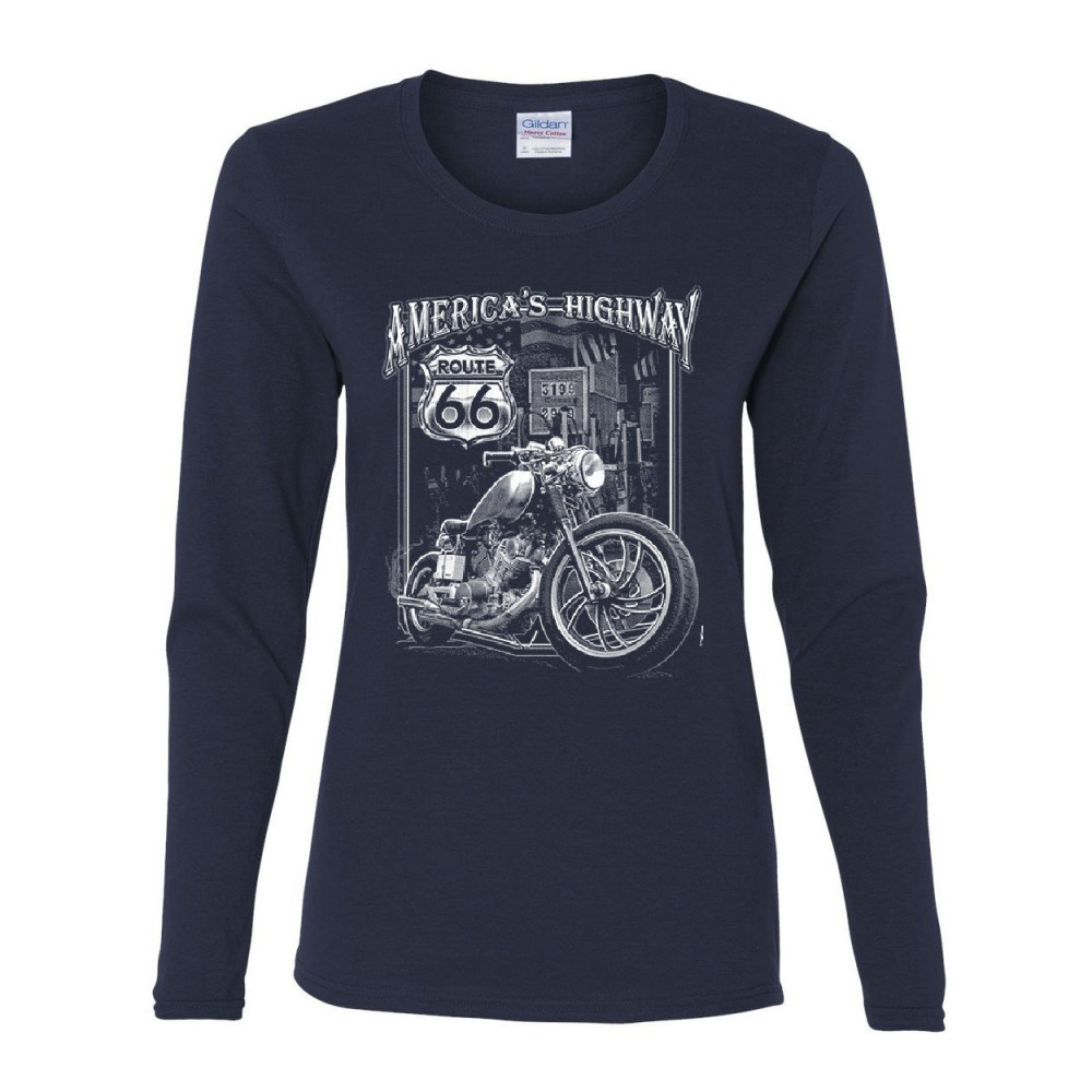 AMERICA'S HIGHWAY HISTORIC ROUTE 66 america's highway women's long sleeve tee route 66 mc motorcycle chopper bobber navy blue