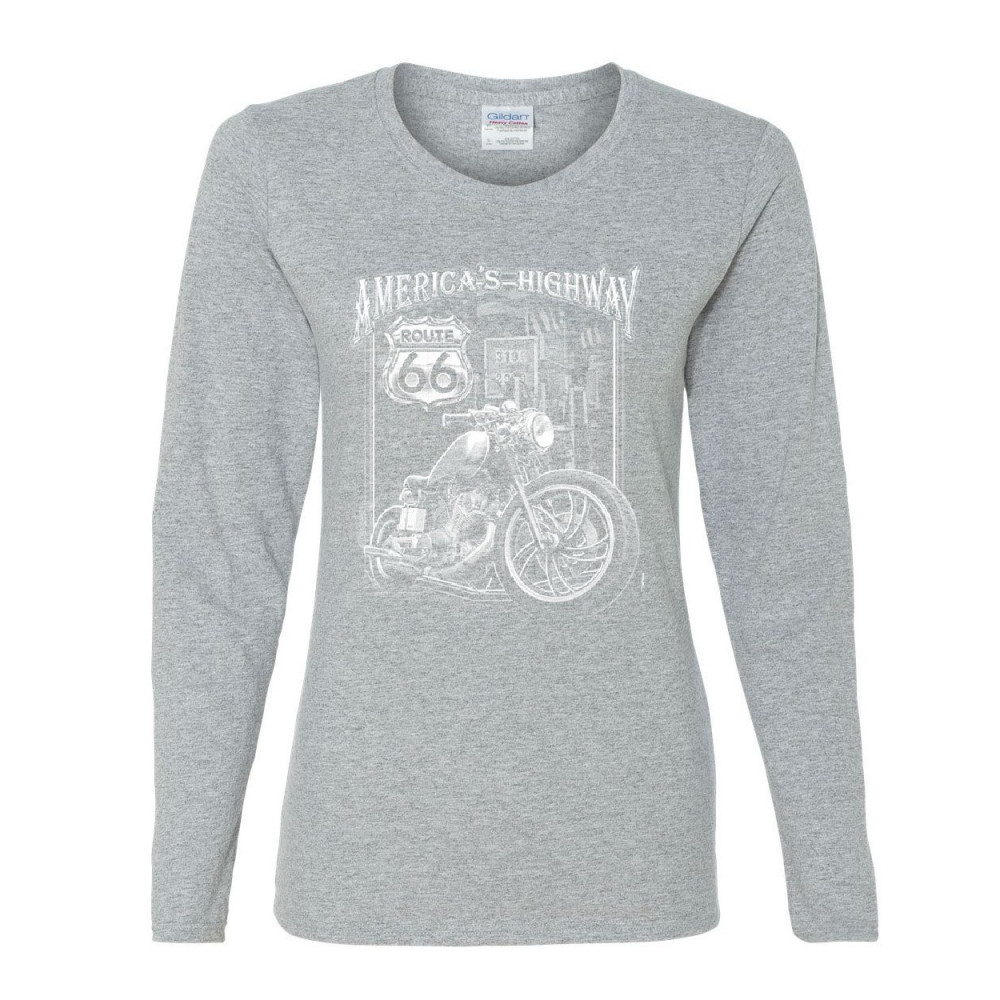 AMERICA'S HIGHWAY HISTORIC ROUTE 66 america's highway women's long sleeve tee route 66 mc motorcycle chopper bobber gray
