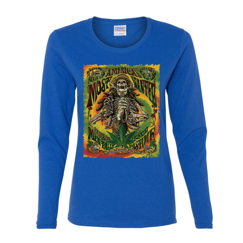 AMERICA'S MOST WANTED women's long sleeve tee 420 smoking weed marijuana rasta royal blue