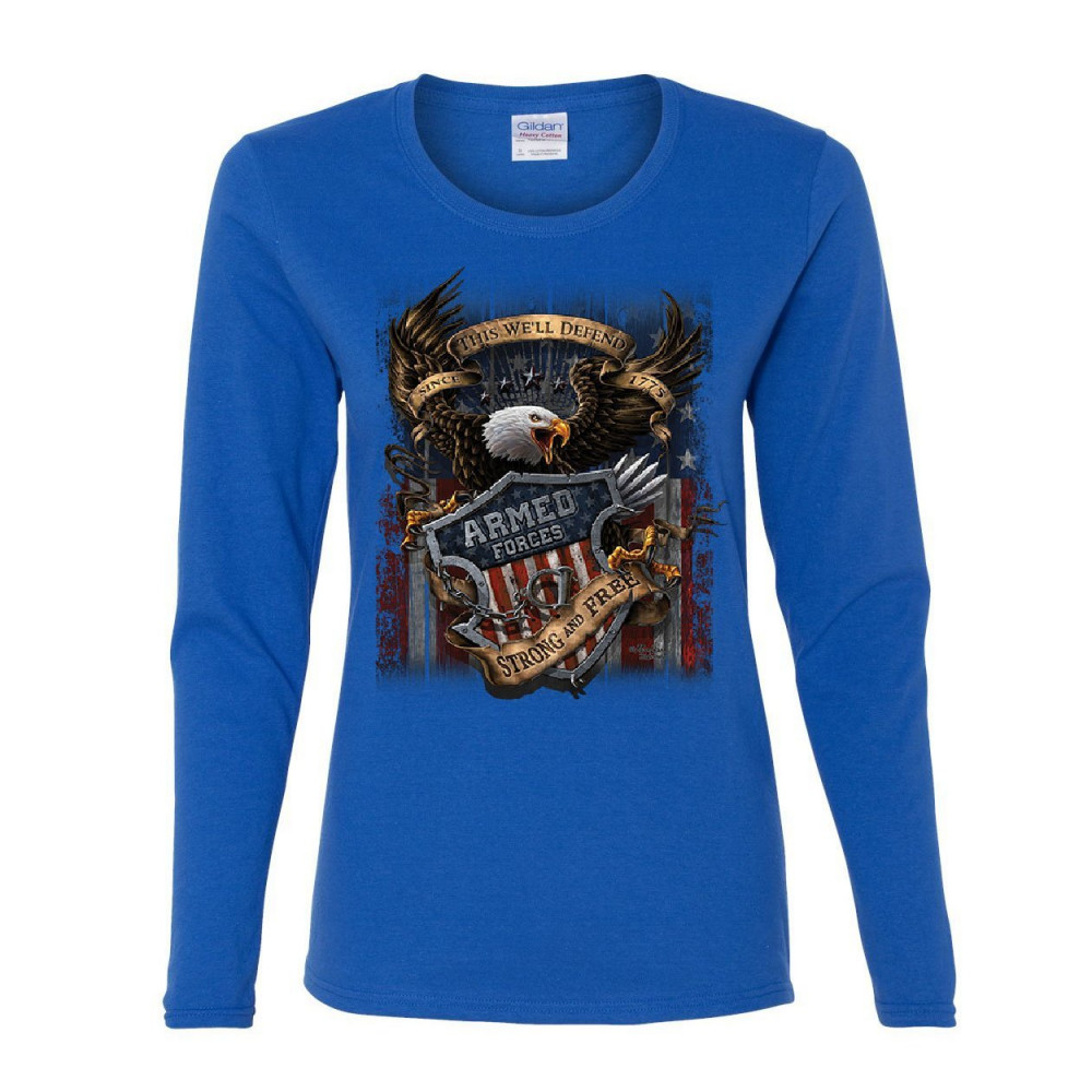 ARMED FORCES BALD EAGLE women's long sleeve tee army this we'll defend us flag royal blue