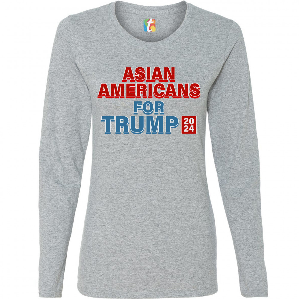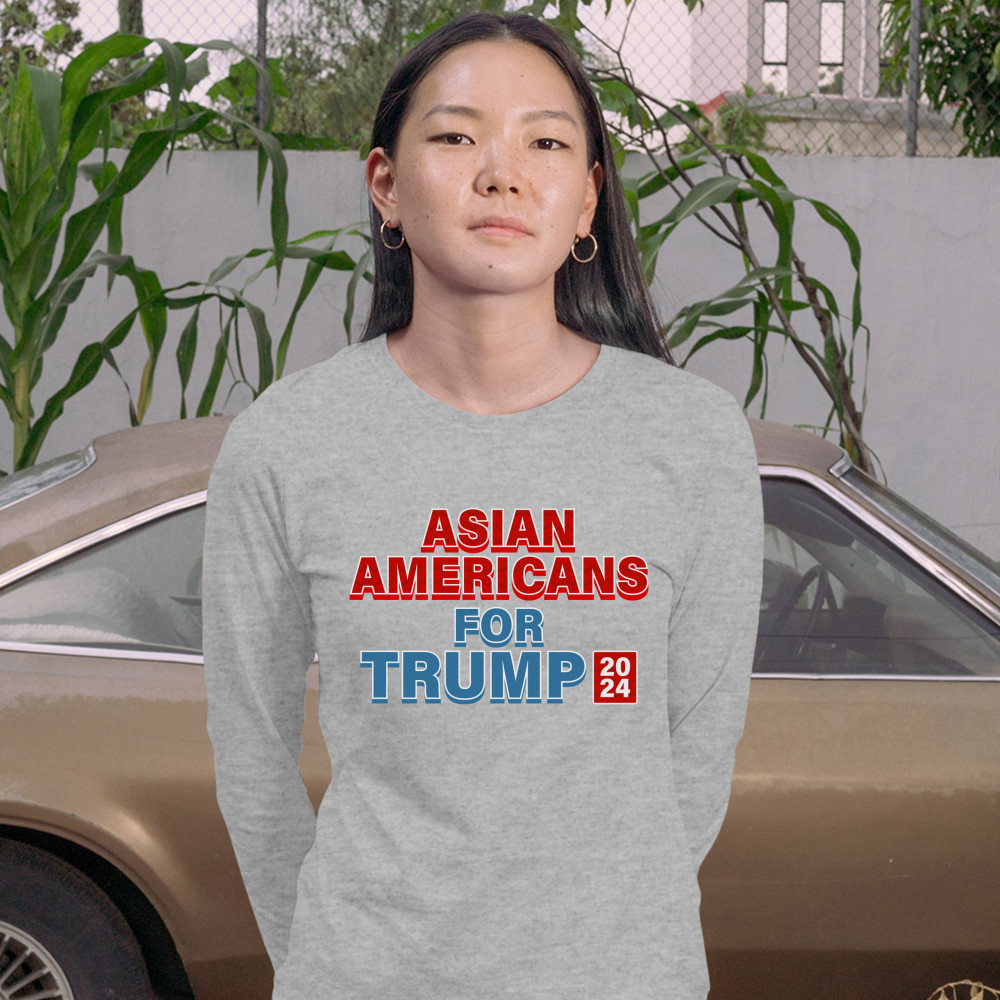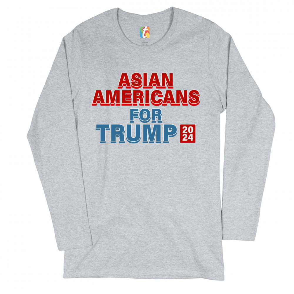 A political print saying "Asian Americans for Trump 2024". The words "Asian Americans" and the square with 2024 also have a pattern inside. A great choice to wear for a Trump rally or give as a gift to a Donald Trump supporter before 2024 presidential ele