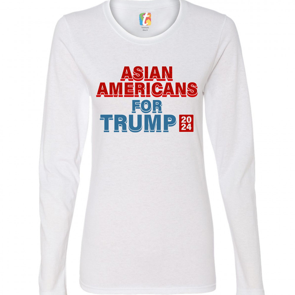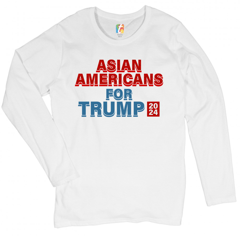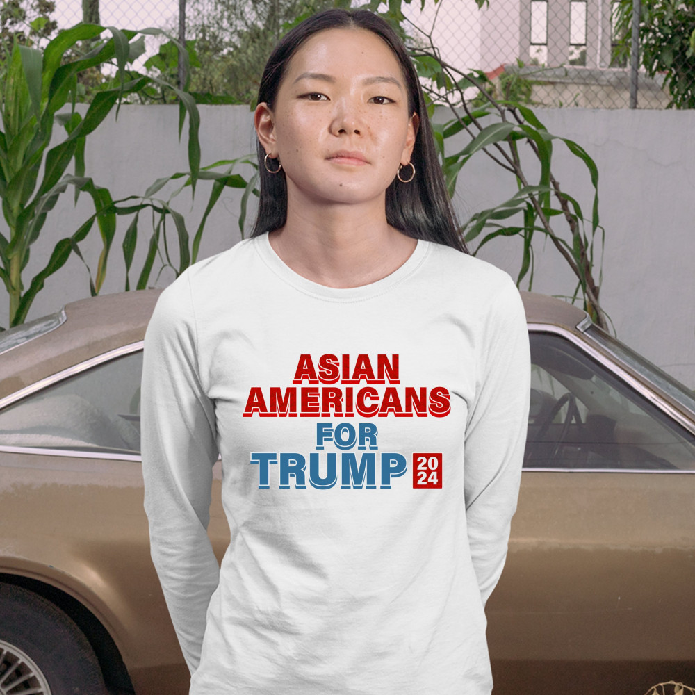 A political print saying "Asian Americans for Trump 2024". The words "Asian Americans" and the square with 2024 also have a pattern inside. A great choice to wear for a Trump rally or give as a gift to a Donald Trump supporter before 2024 presidential ele
