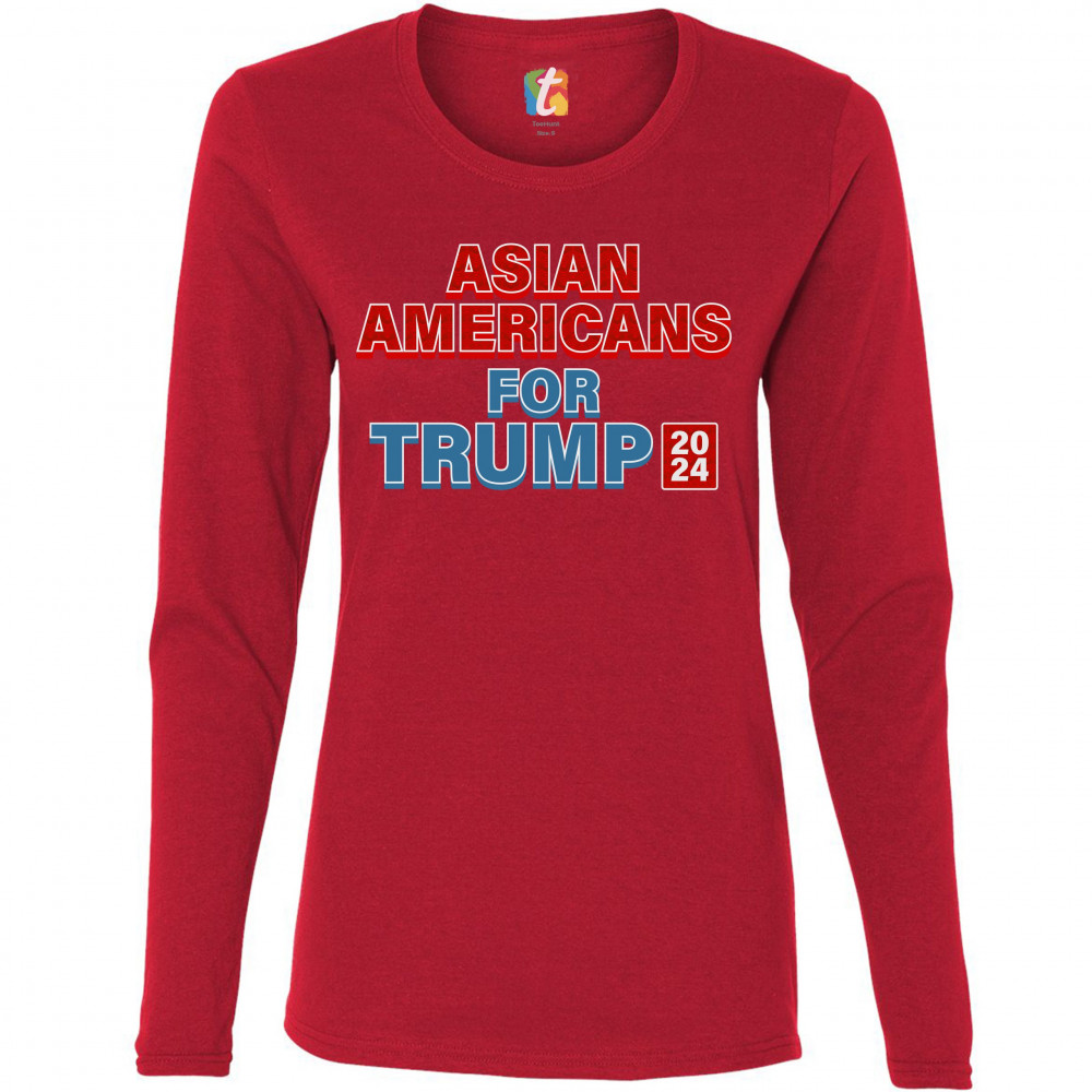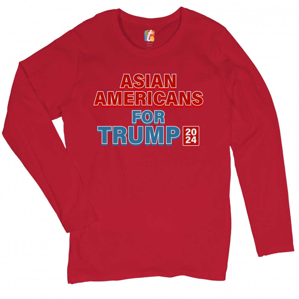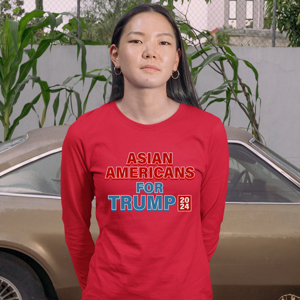 A political print saying "Asian Americans for Trump 2024". The words "Asian Americans" and the square with 2024 also have a pattern inside. A great choice to wear for a Trump rally or give as a gift to a Donald Trump supporter before 2024 presidential ele