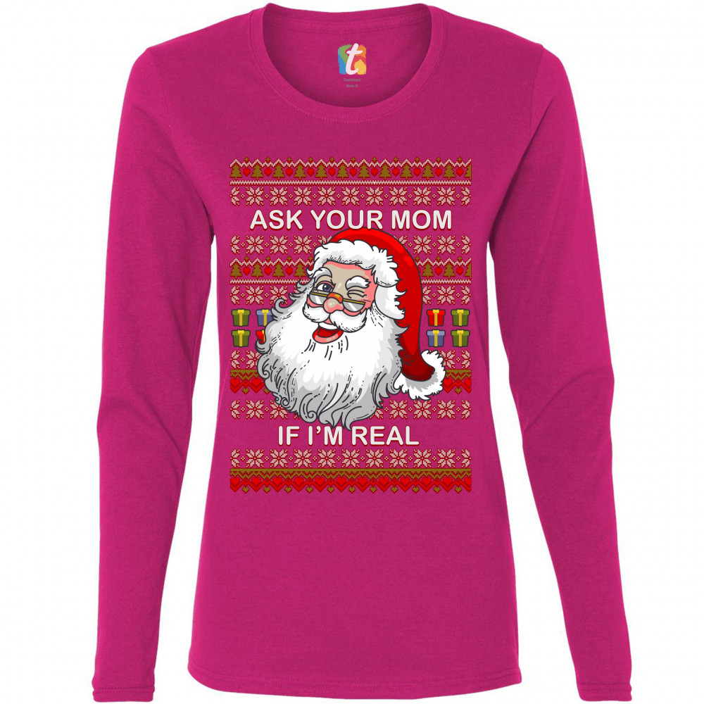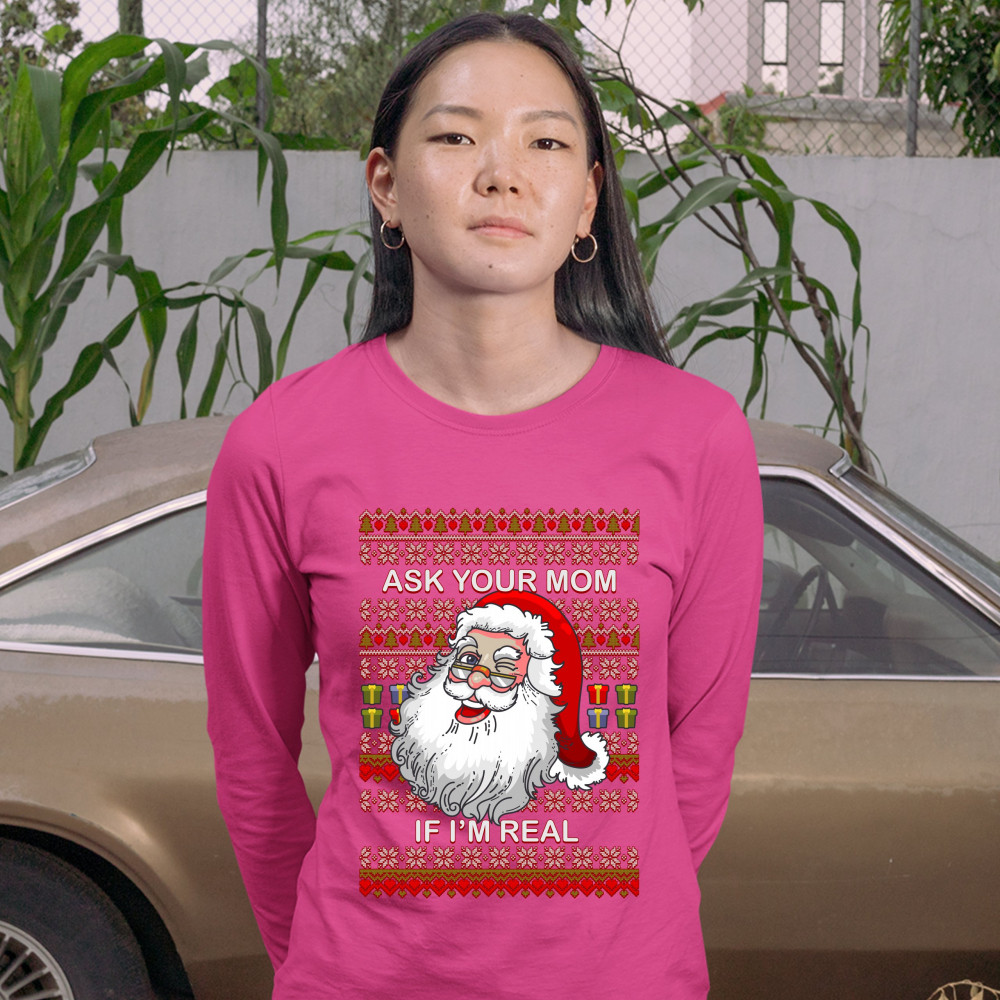 ASK YOUR MOM IF I'M REAL women's long sleeve t-shirt ugly sweater christmas pink