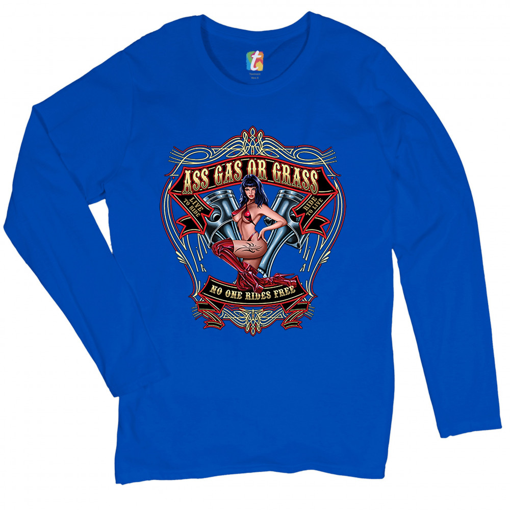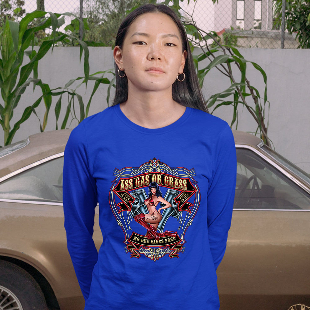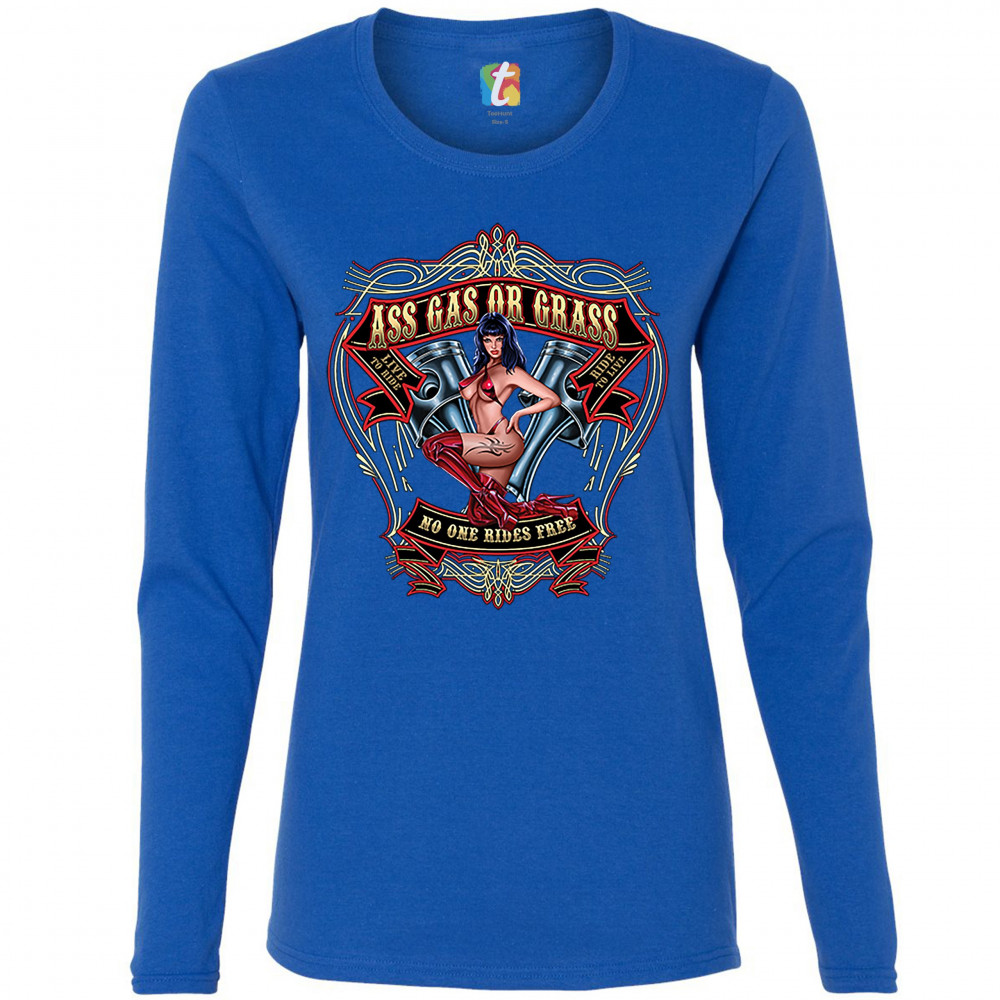 ASS GAS OR GRASS women's long sleeve t-shirt biker no one rides free route 66 royal blue