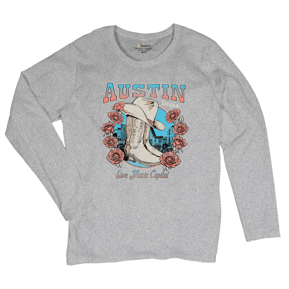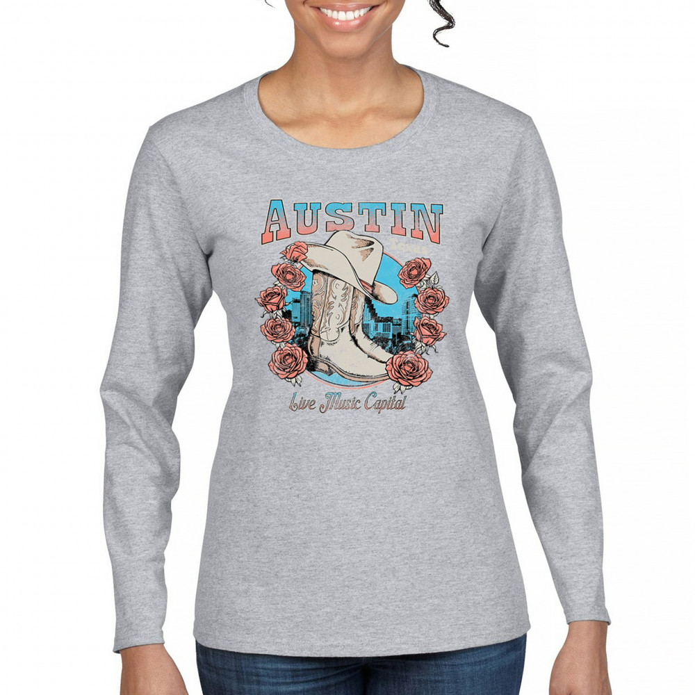 Austin TX Live Music Capital comes alive in this vintage cowgirl boots and hat design, accented by roses and the city skyline. Perfect for lovers of country music, honkytonk vibes, and western chic, this design embodies southern spirit, rustic grit, and the proud Americana aesthetic of Texas’ iconic music scene.