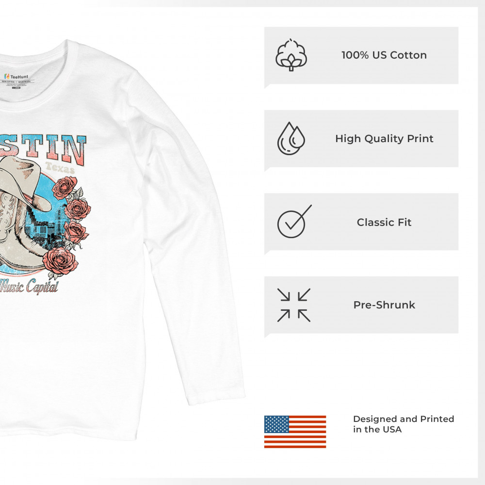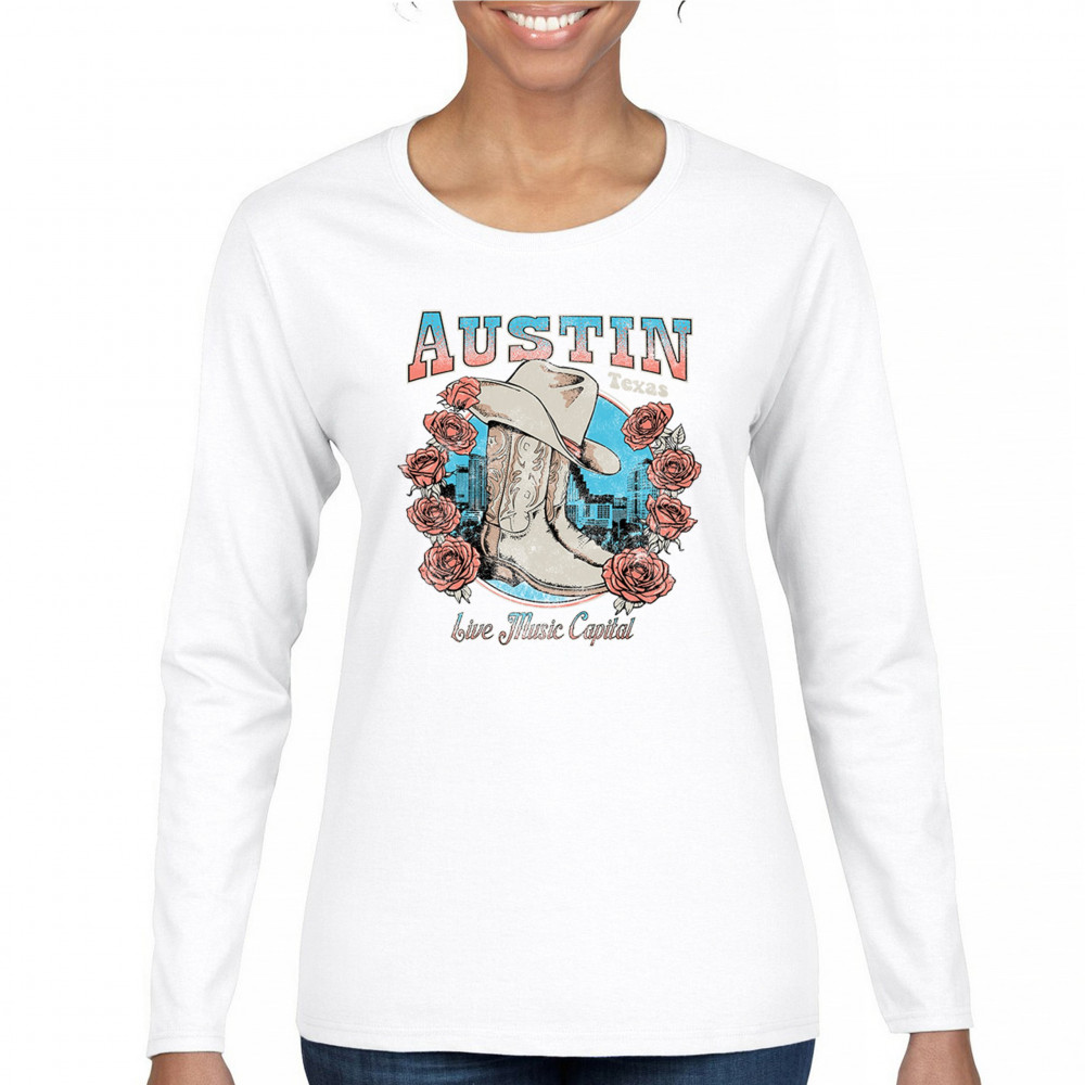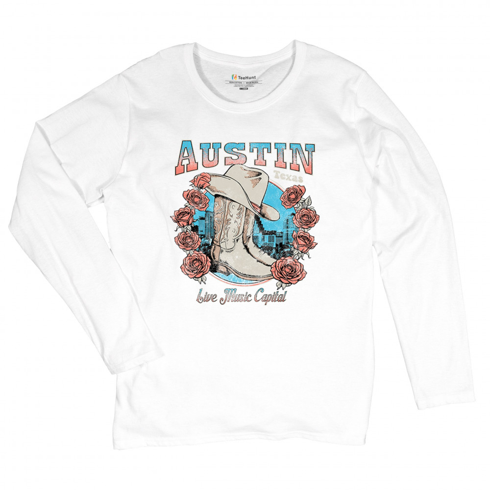 Austin TX Live Music Capital comes alive in this vintage cowgirl boots and hat design, accented by roses and the city skyline. Perfect for lovers of country music, honkytonk vibes, and western chic, this design embodies southern spirit, rustic grit, and the proud Americana aesthetic of Texas’ iconic music scene.