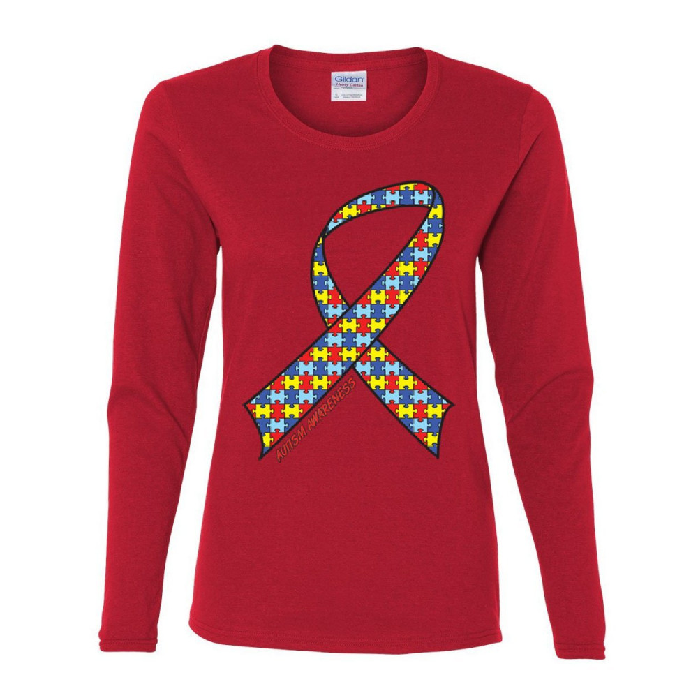 AUTISM AWARENESS RIBBON women's long sleeve tee support care love asd asperger red