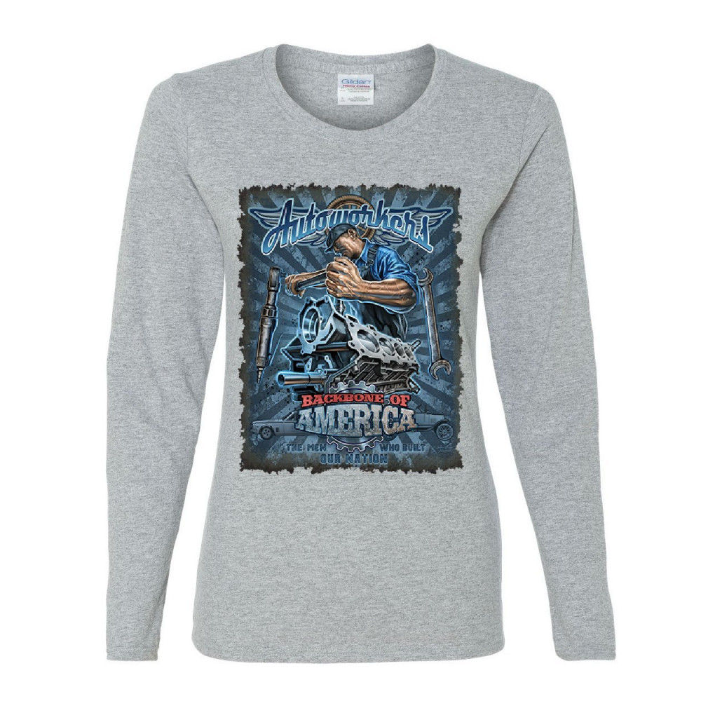 AUTOWORKERS - BACKBONE OF AMERICA autoworkers backbone of america women's long sleeve tee car motor mechanic union gray