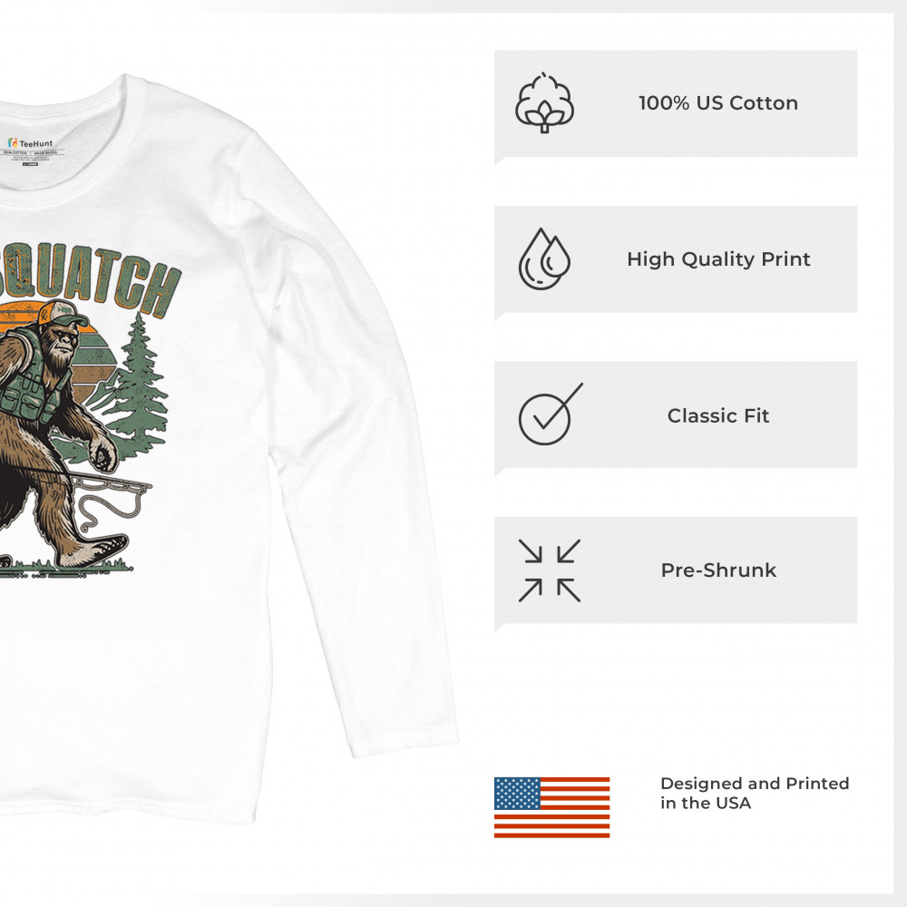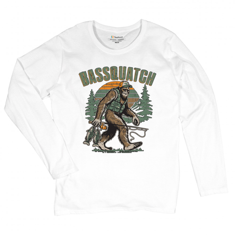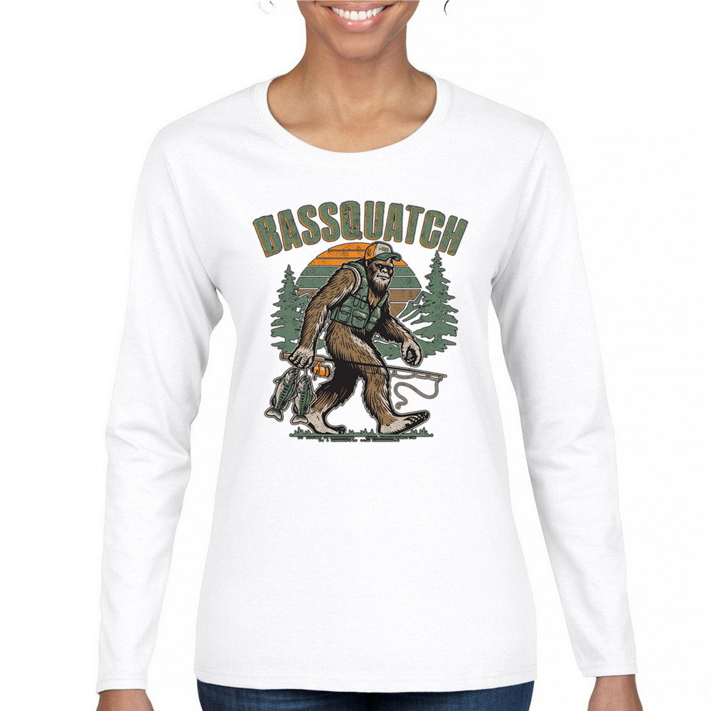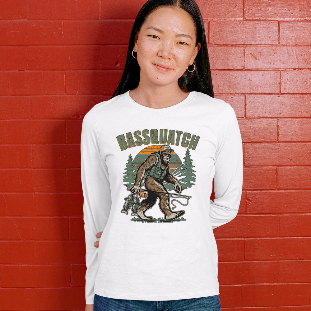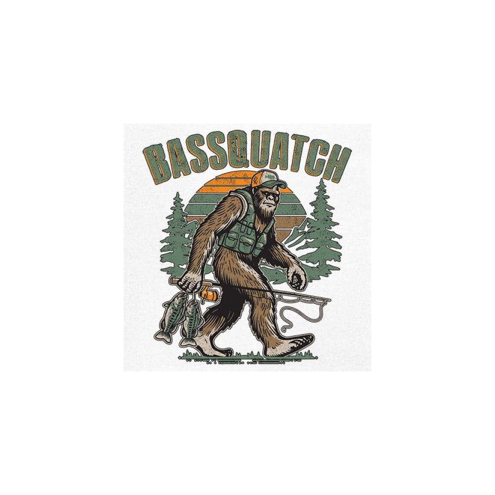 Funny Bassquatch design blends Bigfoot, fishing humor, and retro forest style. Great for anglers, cryptid lovers, and outdoorsy pun fans.