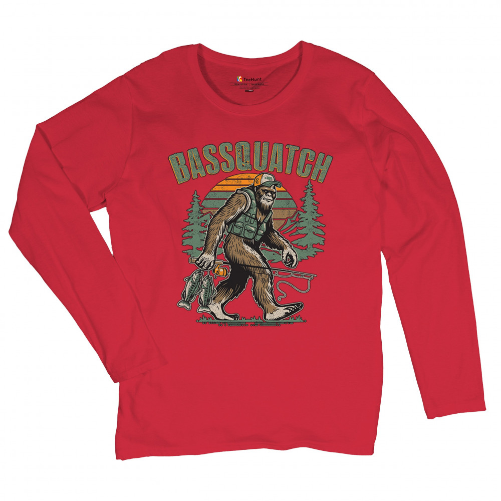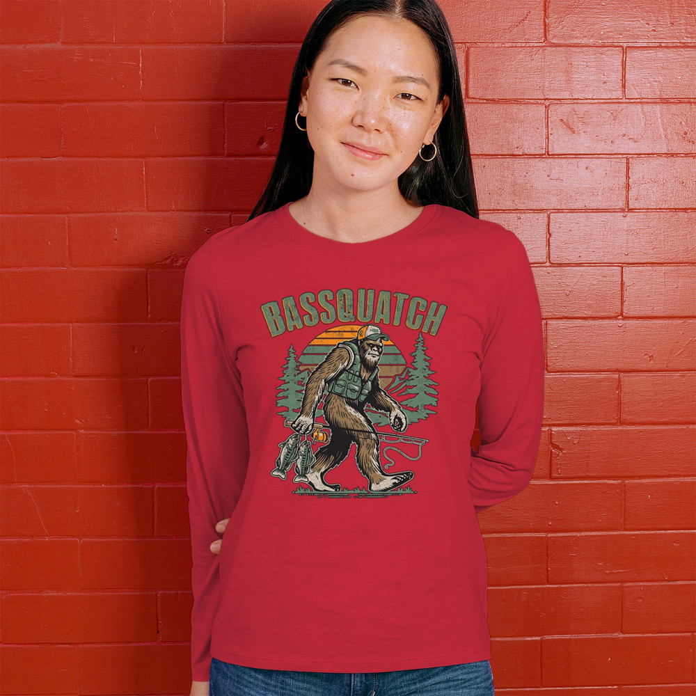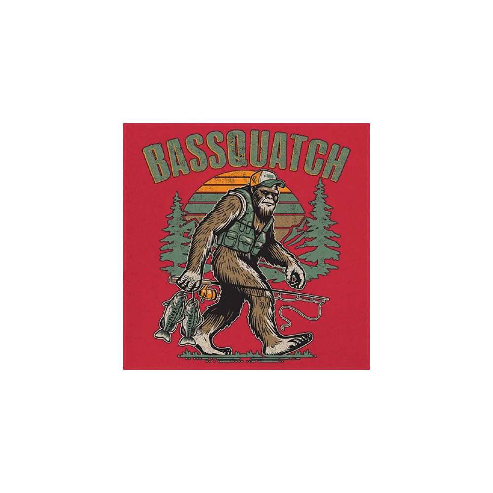 Funny Bassquatch design blends Bigfoot, fishing humor, and retro forest style. Great for anglers, cryptid lovers, and outdoorsy pun fans.