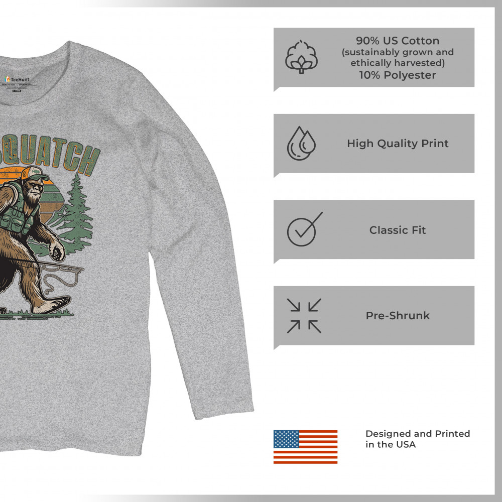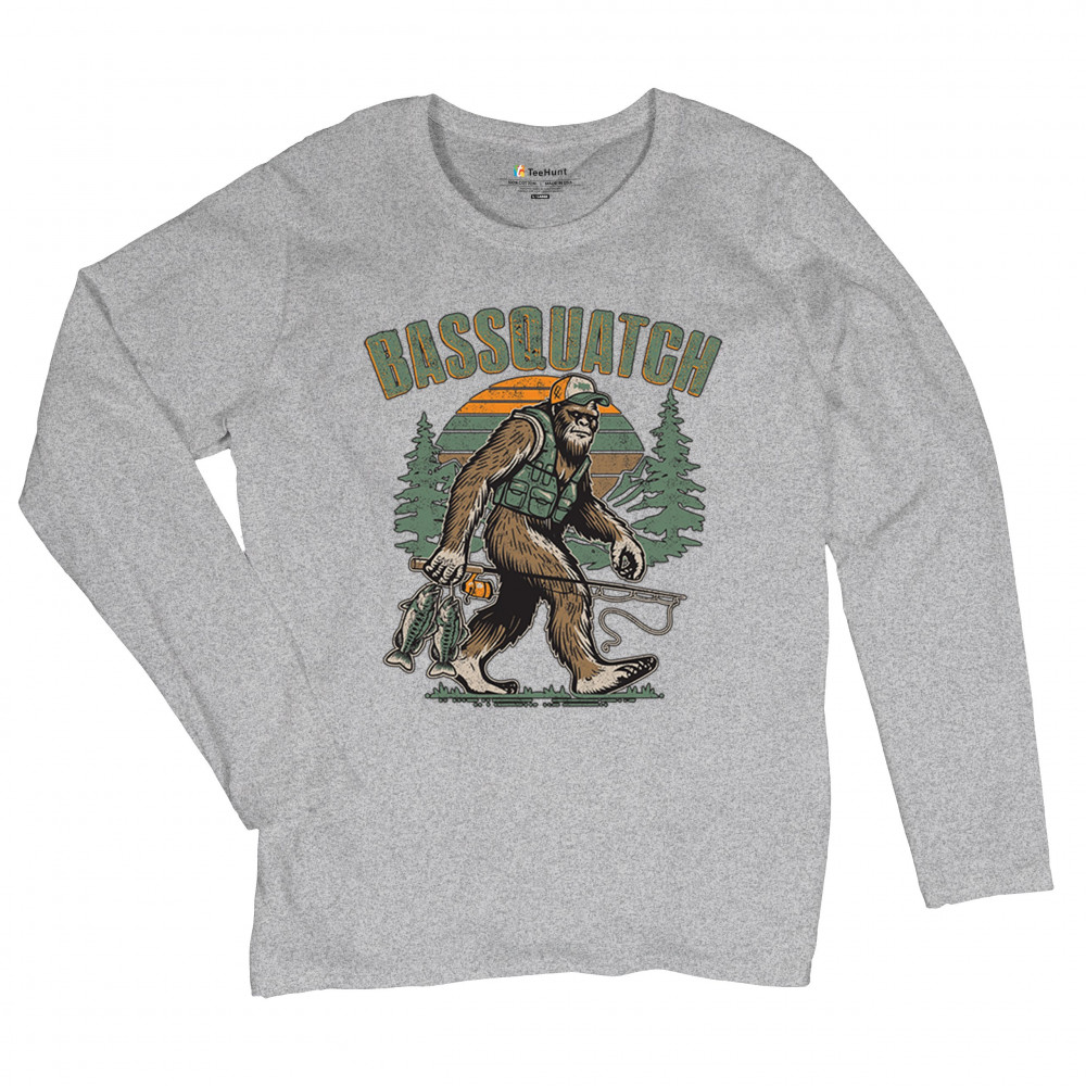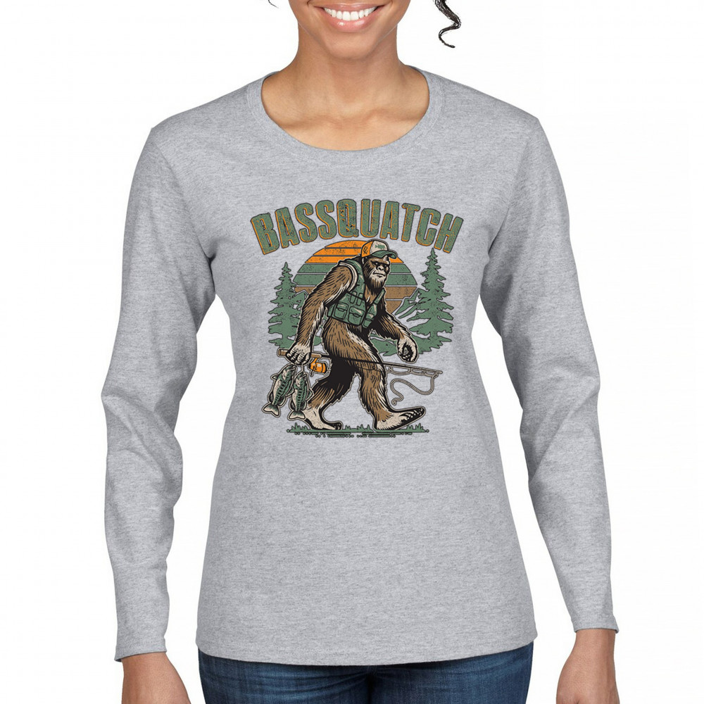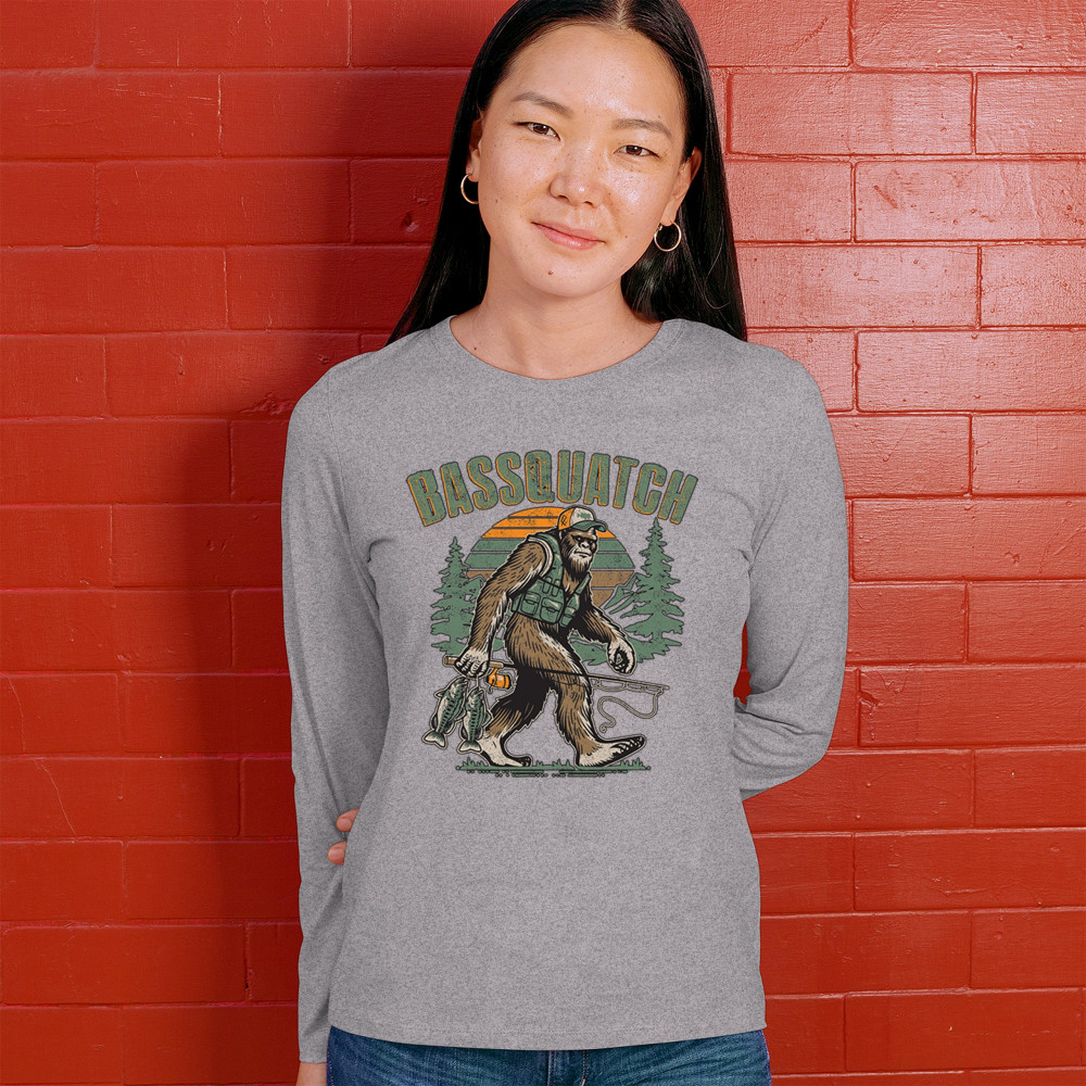 Funny Bassquatch design blends Bigfoot, fishing humor, and retro forest style. Great for anglers, cryptid lovers, and outdoorsy pun fans.