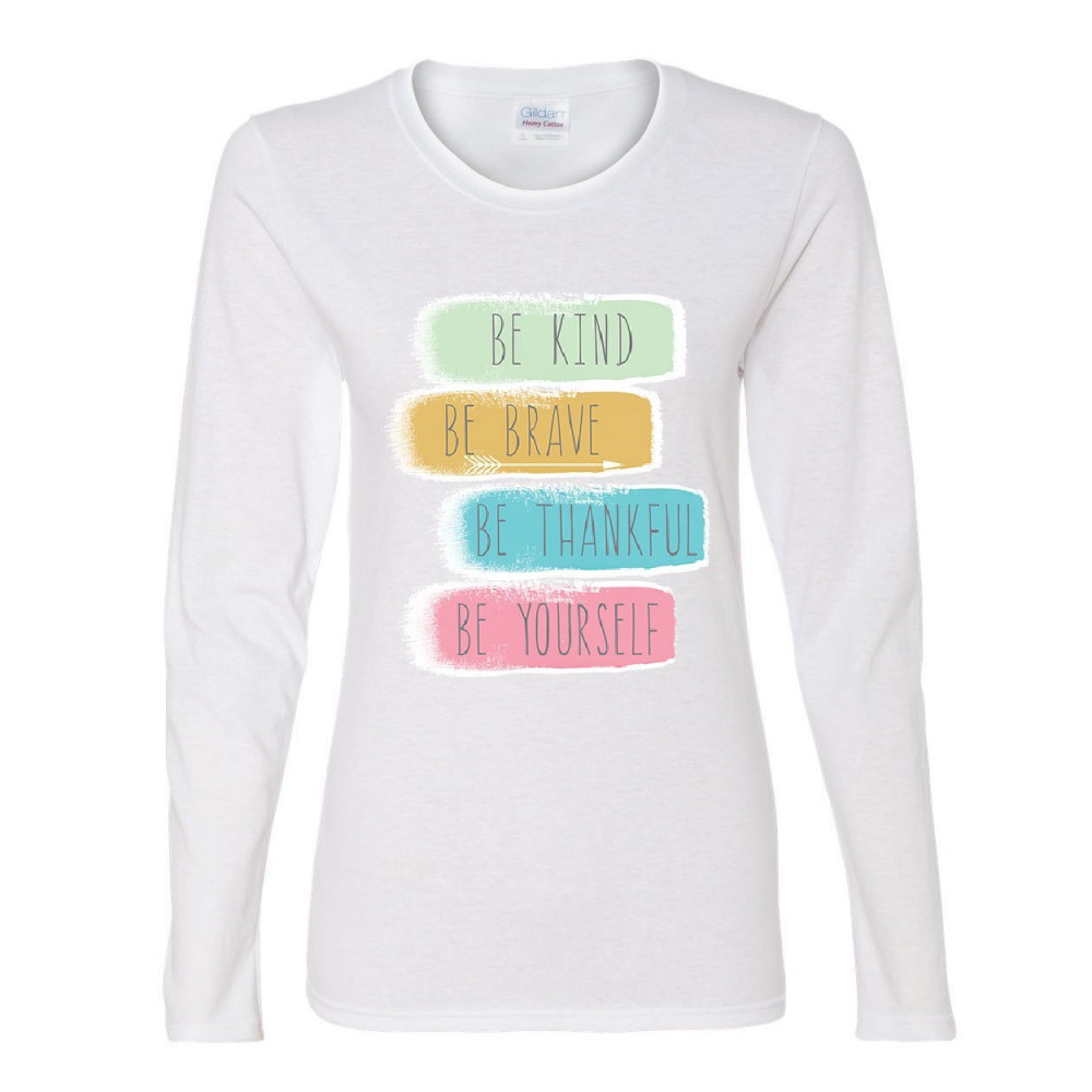 BE YOURSELF be kind brave thankful women's long sleeve tee motivation positive white