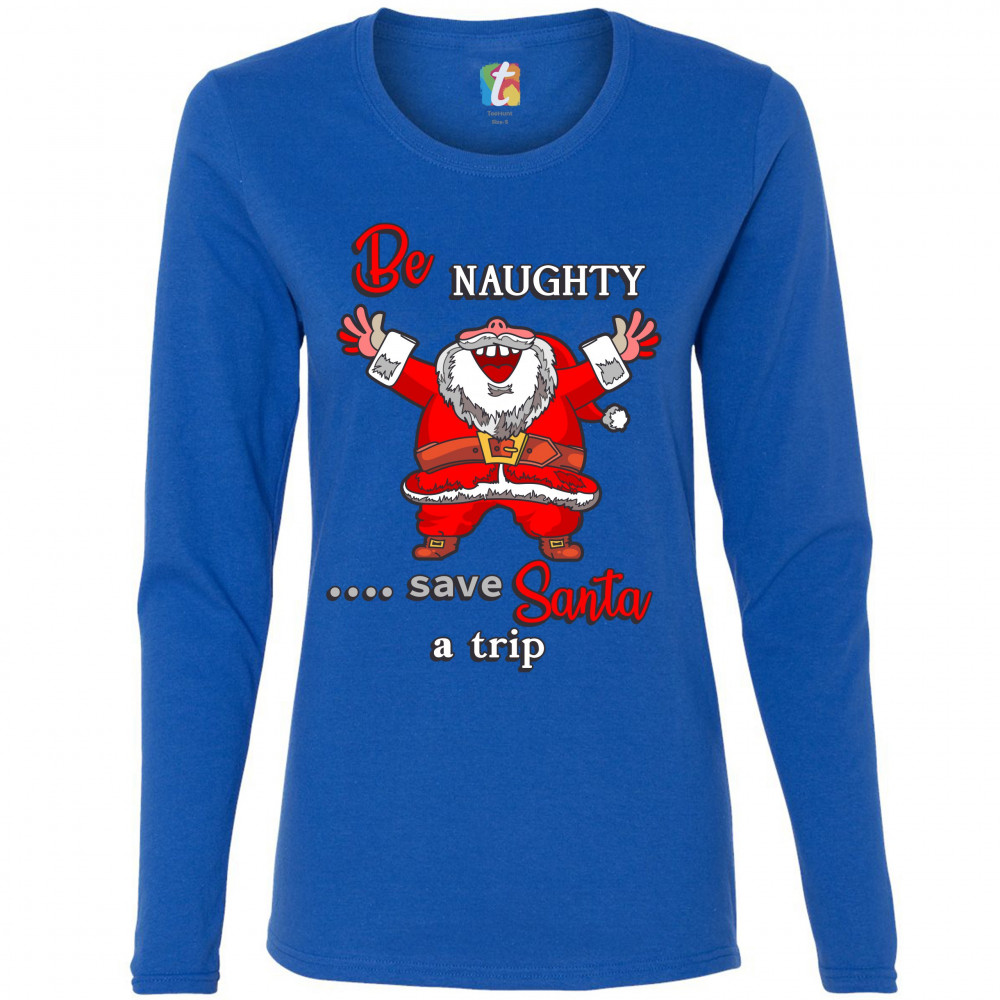 BE NAUGHTY SAVE SANTA A TRIP women's long sleeve t-shirt christmas eve holiday royal blue