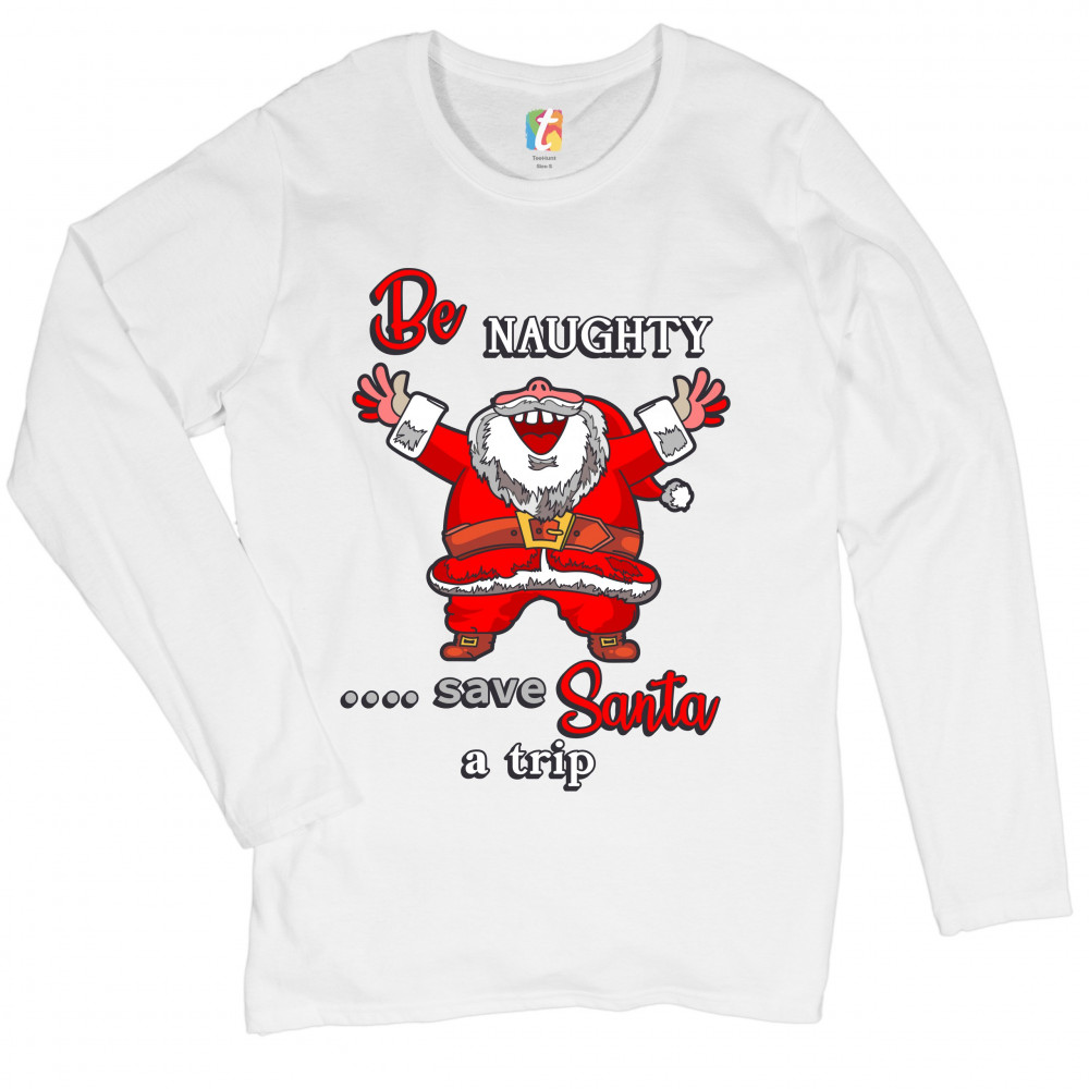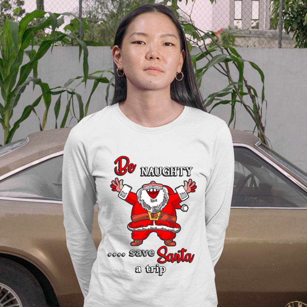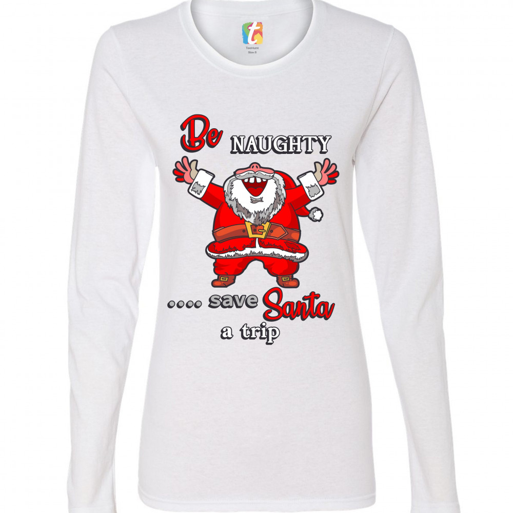 BE NAUGHTY SAVE SANTA A TRIP women's long sleeve t-shirt christmas eve holiday white