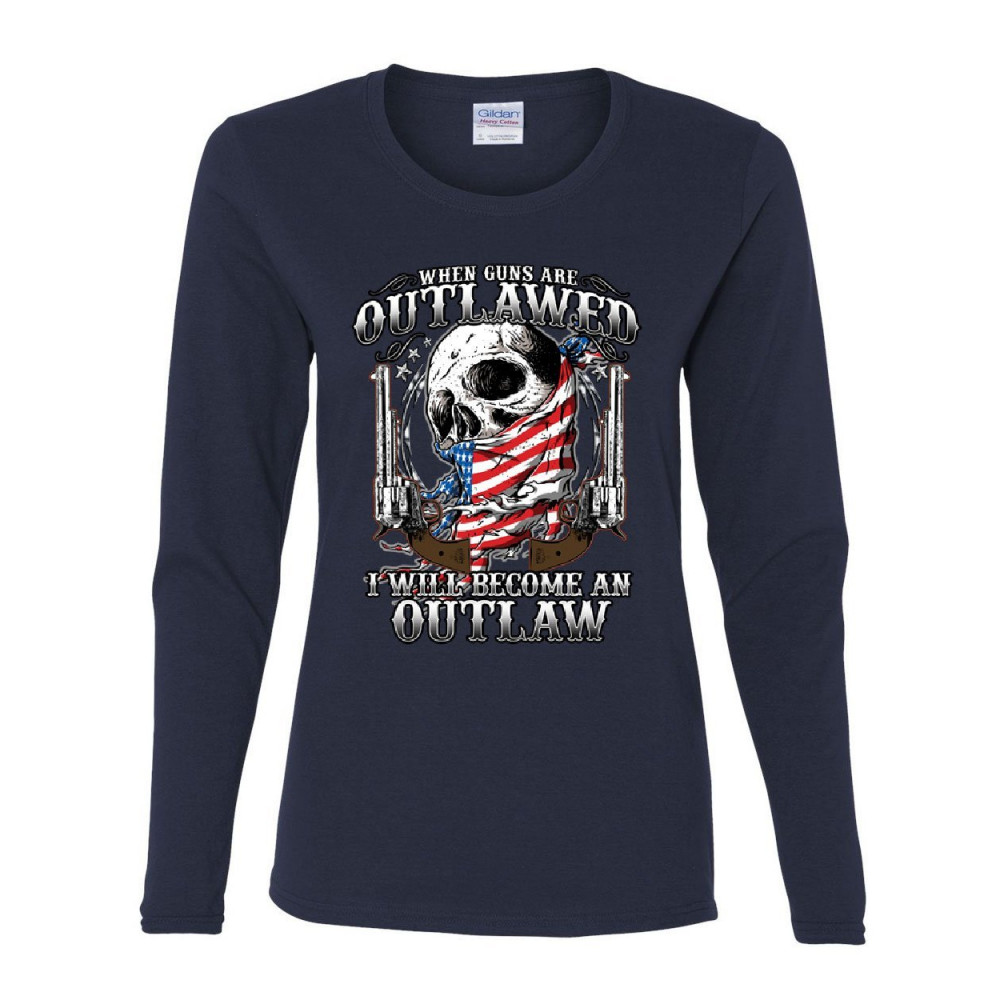 BECOME AN OUTLAW women's long sleeve tee 2nd amendment right to bear arms skull navy blue