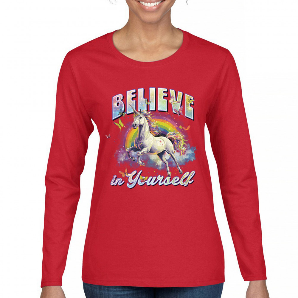 Believe in Yourself unicorn rainbow design with whimsical unicorn shirt, fantasy rainbow style, enchanted unicorn magic, galaxy sparkle, and positivity.