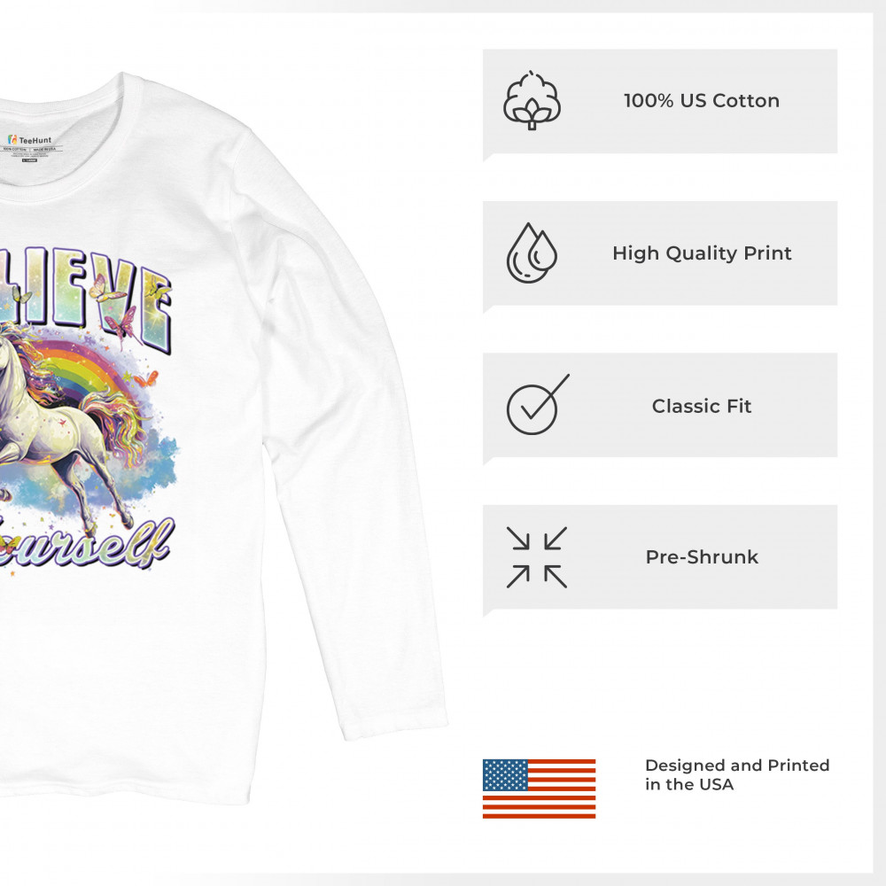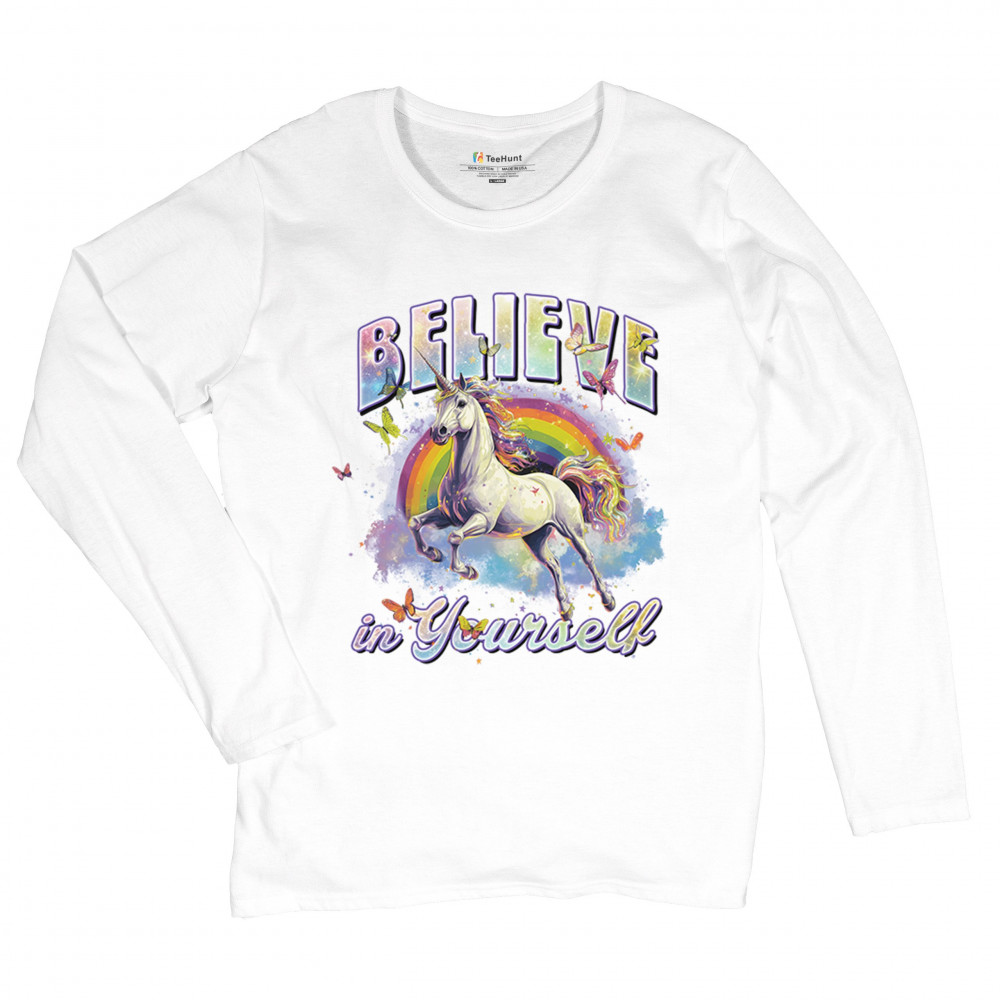 Bring fairytale magic into your everyday life with this Believe in Yourself unicorn rainbow design. Featuring whimsical unicorn shirt details, fantasy rainbow shirt colors, and enchanted unicorn shirt sparkle, it inspires positivity and confidence. A magical rainbow unicorn and galaxy unicorn shirt full of charm, sparkle unicorn shirt vibes, and uplifting energy for all dreamers.
