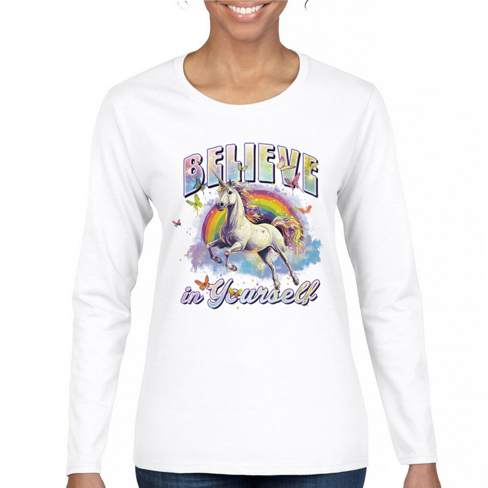 Believe in Yourself unicorn rainbow design with whimsical unicorn shirt, fantasy rainbow style, enchanted unicorn magic, galaxy sparkle, and positivity.