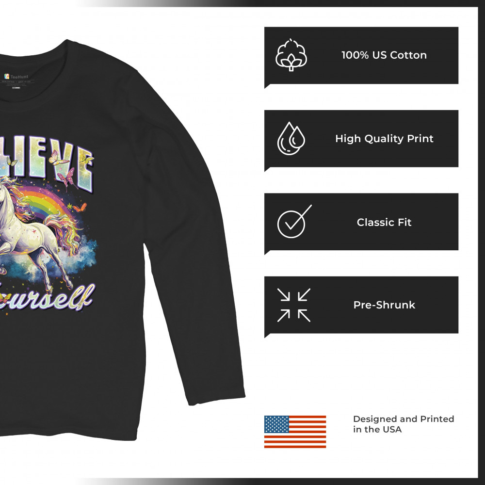 Bring fairytale magic into your everyday life with this Believe in Yourself unicorn rainbow design. Featuring whimsical unicorn shirt details, fantasy rainbow shirt colors, and enchanted unicorn shirt sparkle, it inspires positivity and confidence. A magical rainbow unicorn and galaxy unicorn shirt full of charm, sparkle unicorn shirt vibes, and uplifting energy for all dreamers.