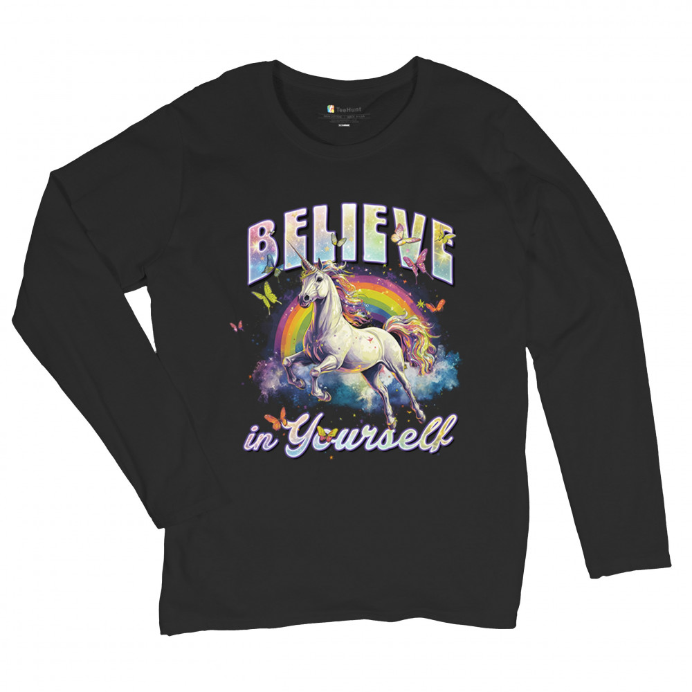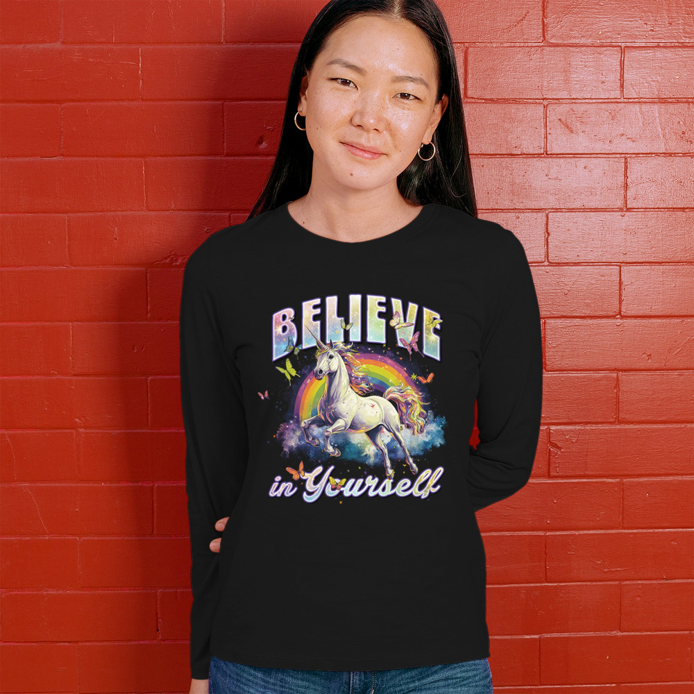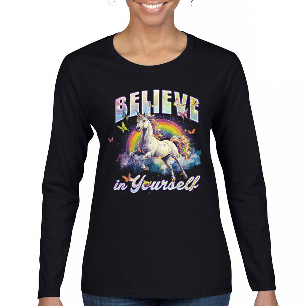 BELIEVE IN YOURSELF UNICORN women's long sleeve t-shirt colorful rainbow magical black