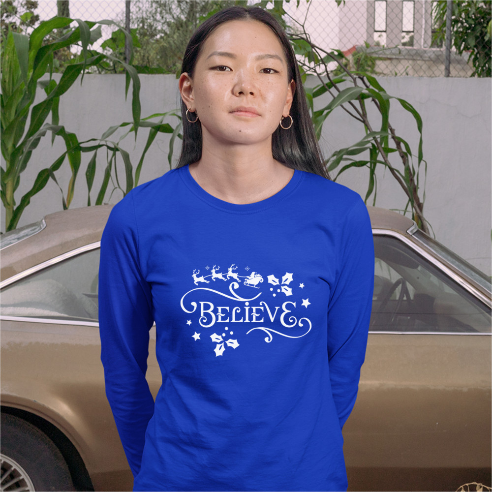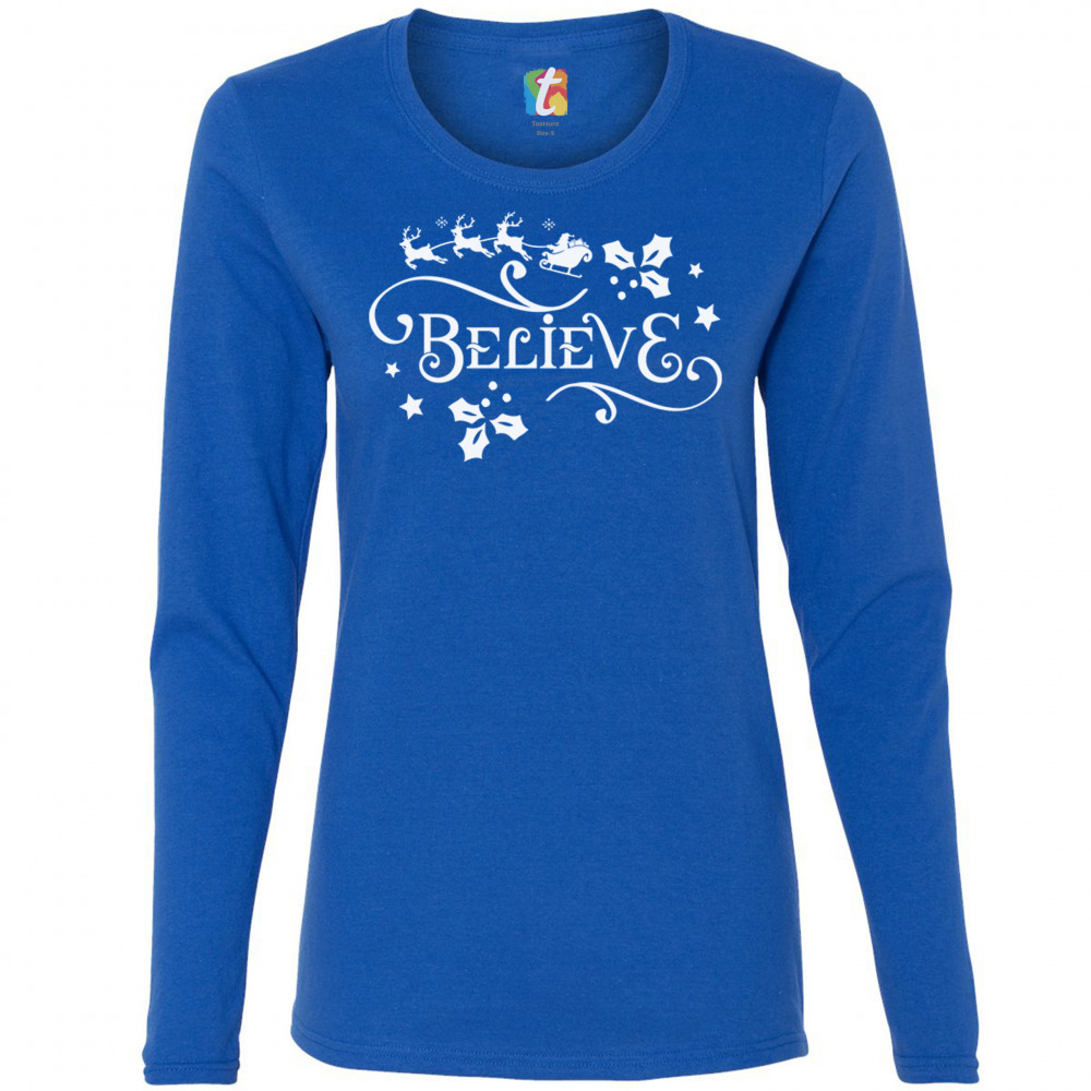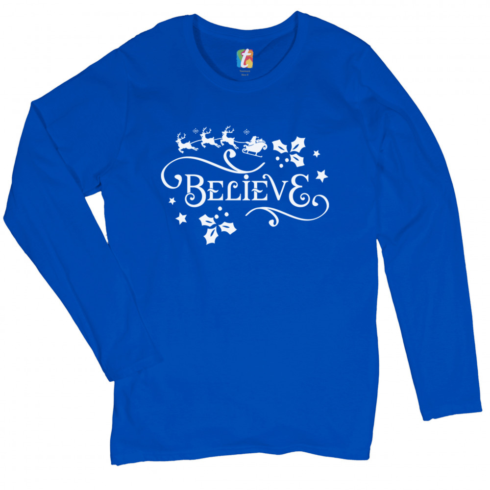 BELIEVE women's long sleeve t-shirt merry christmas santa rudolph mistletoe royal blue