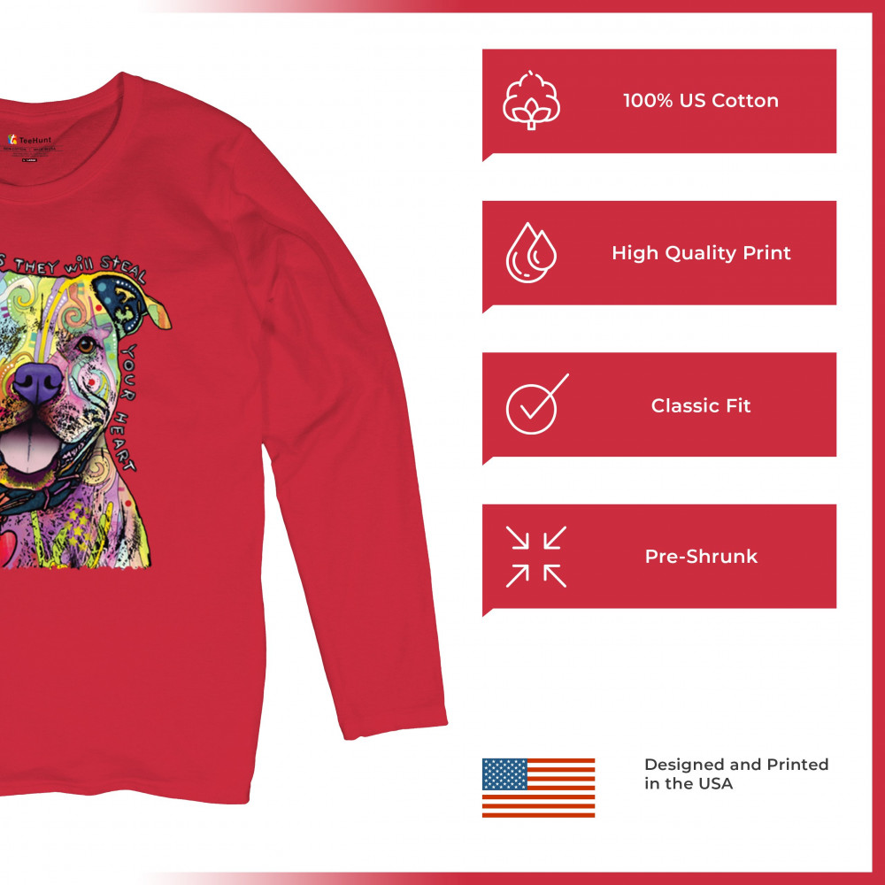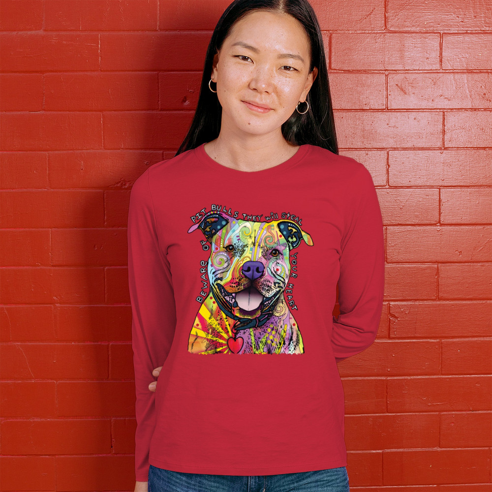 BEWARE OF PIT BULLS women's long sleeve t-shirt dean russo art colorful cute dog red