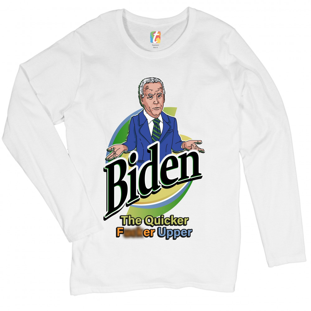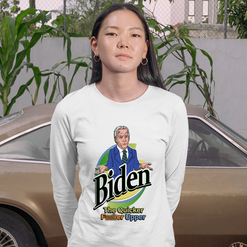 A funny political print featuring a confused Joe Biden shrugging his shoulders and spreading his arms. The print says "Biden the Quicker F*cker Upper". A great choice to wear for a Trump rally or give as a gift to a Donald Trump supporter before 2024 pres