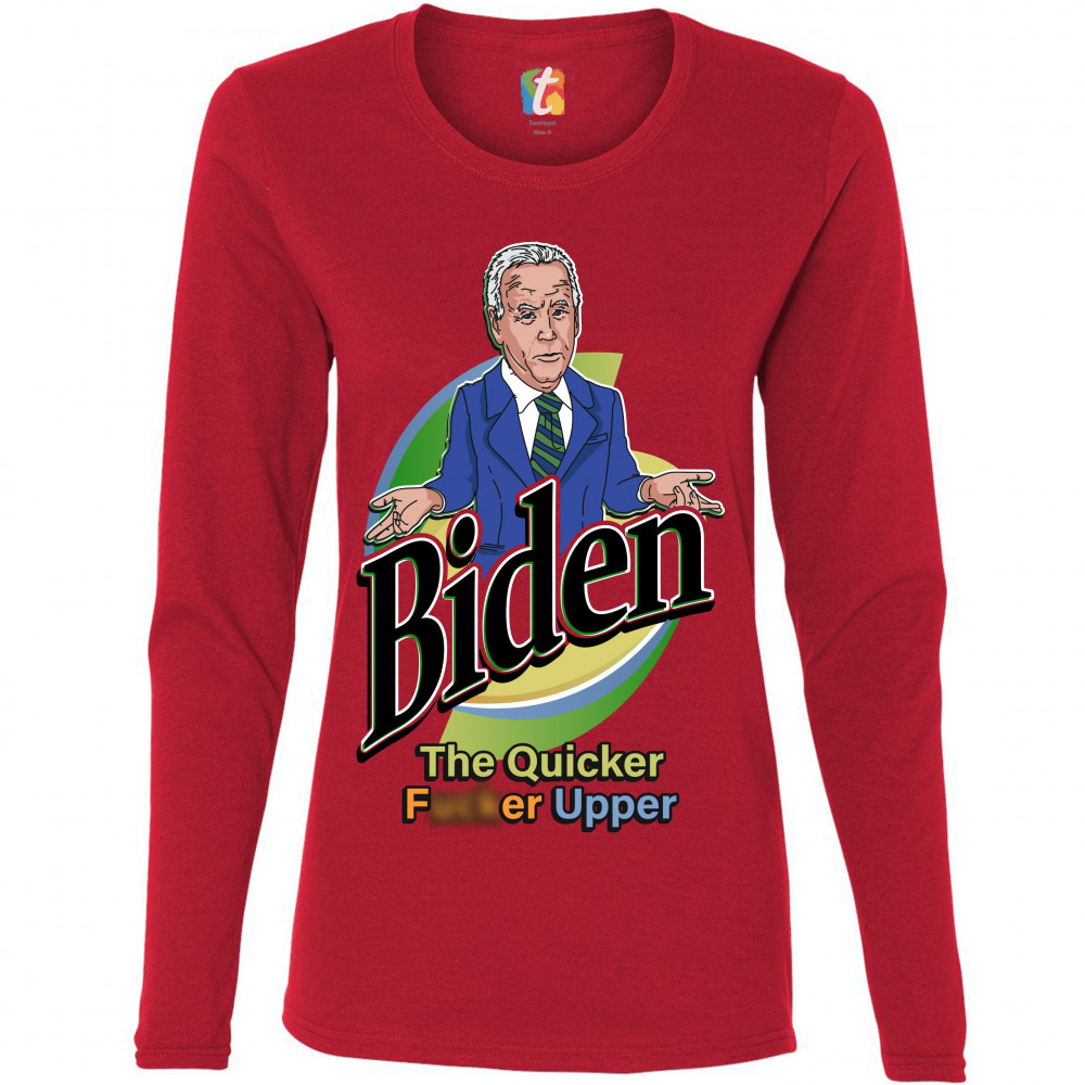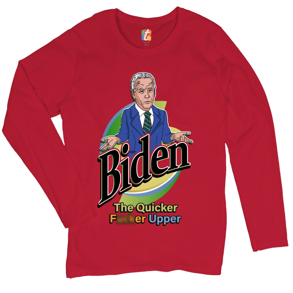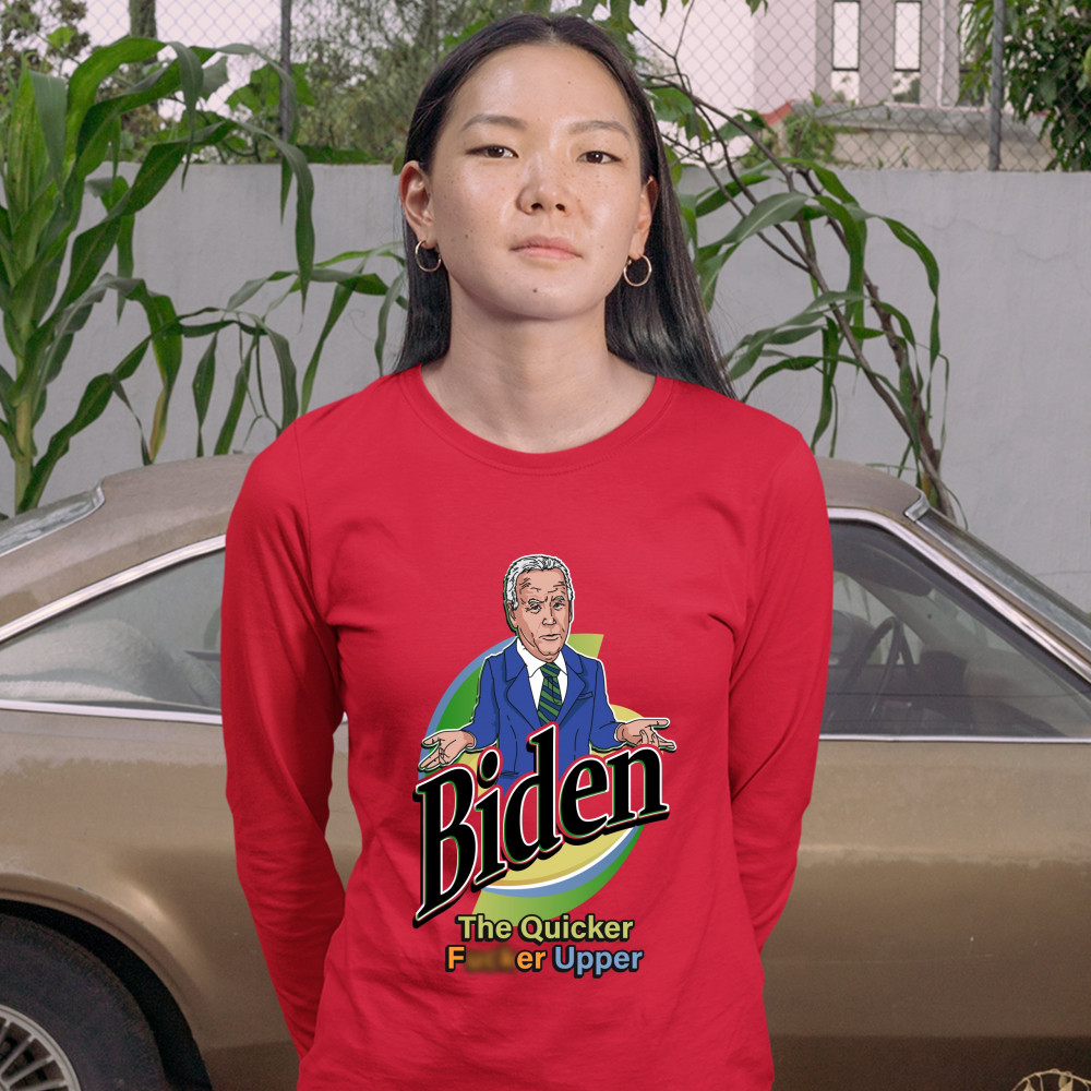 A funny political print featuring a confused Joe Biden shrugging his shoulders and spreading his arms. The print says "Biden the Quicker F*cker Upper". A great choice to wear for a Trump rally or give as a gift to a Donald Trump supporter before 2024 pres