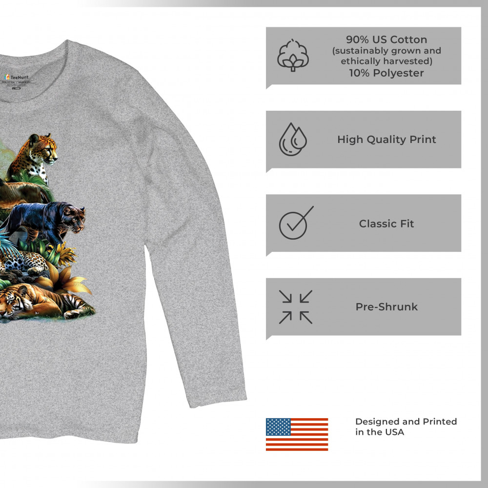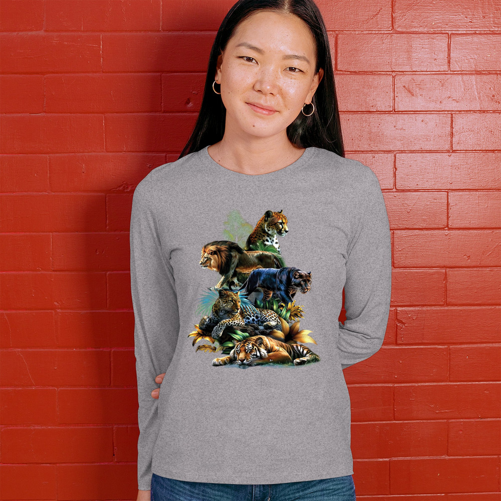 Bold big cat design with lion, tiger, leopard, cheetah, jaguar, and panther. A vivid tribute to wild nature, pride, and animal power.