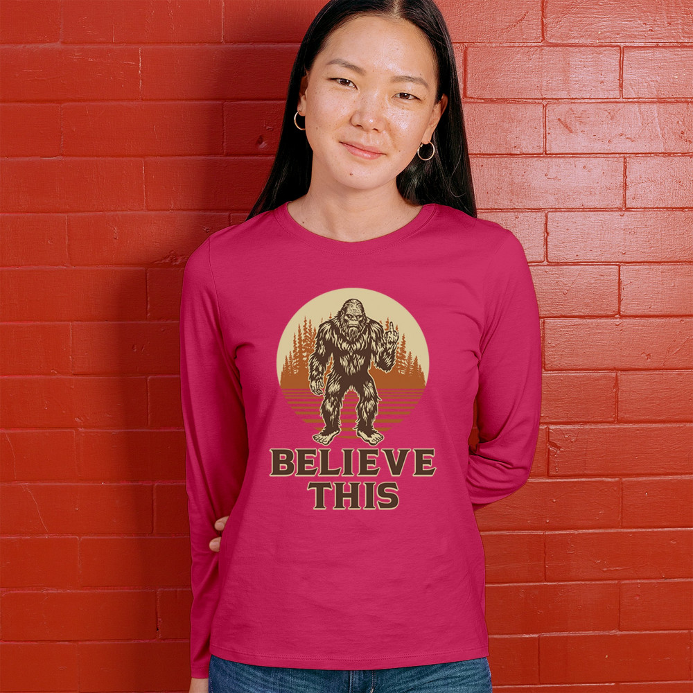The Believe This Bigfoot design blends cryptid folklore with blunt attitude—because sometimes you just don’t care who believes. Featuring Bigfoot flipping the bird against a rustic tree line, it’s perfect for campers, rebels, and fans of sarcastic forest humor. Ideal for hikes, festivals, and off-grid living.