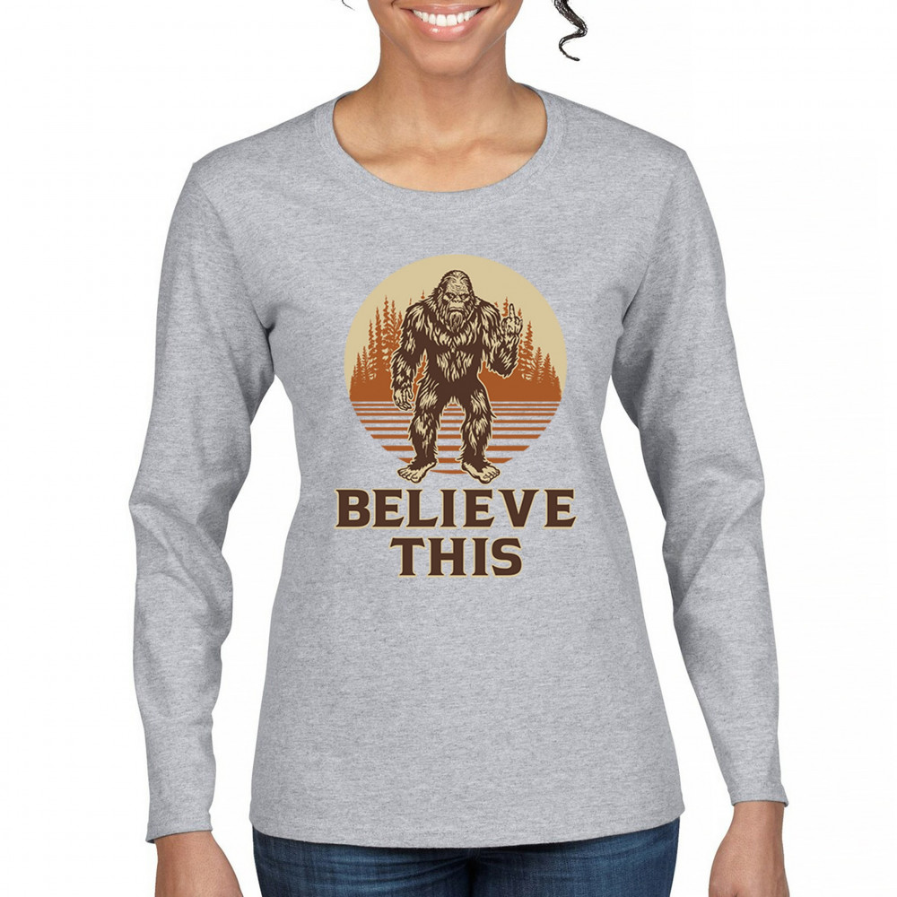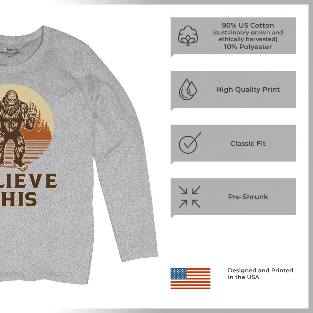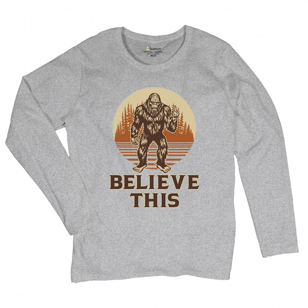 The Believe This Bigfoot design blends cryptid folklore with blunt attitude—because sometimes you just don’t care who believes. Featuring Bigfoot flipping the bird against a rustic tree line, it’s perfect for campers, rebels, and fans of sarcastic forest humor. Ideal for hikes, festivals, and off-grid living.