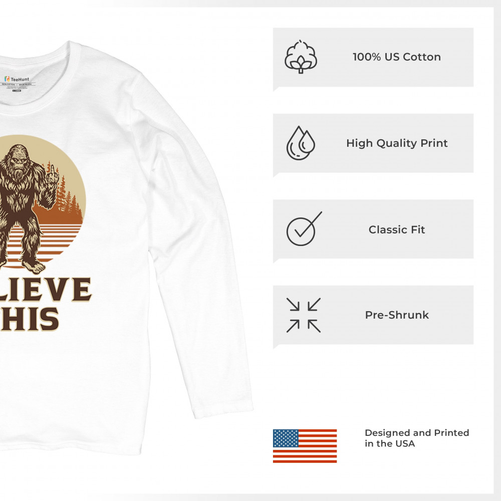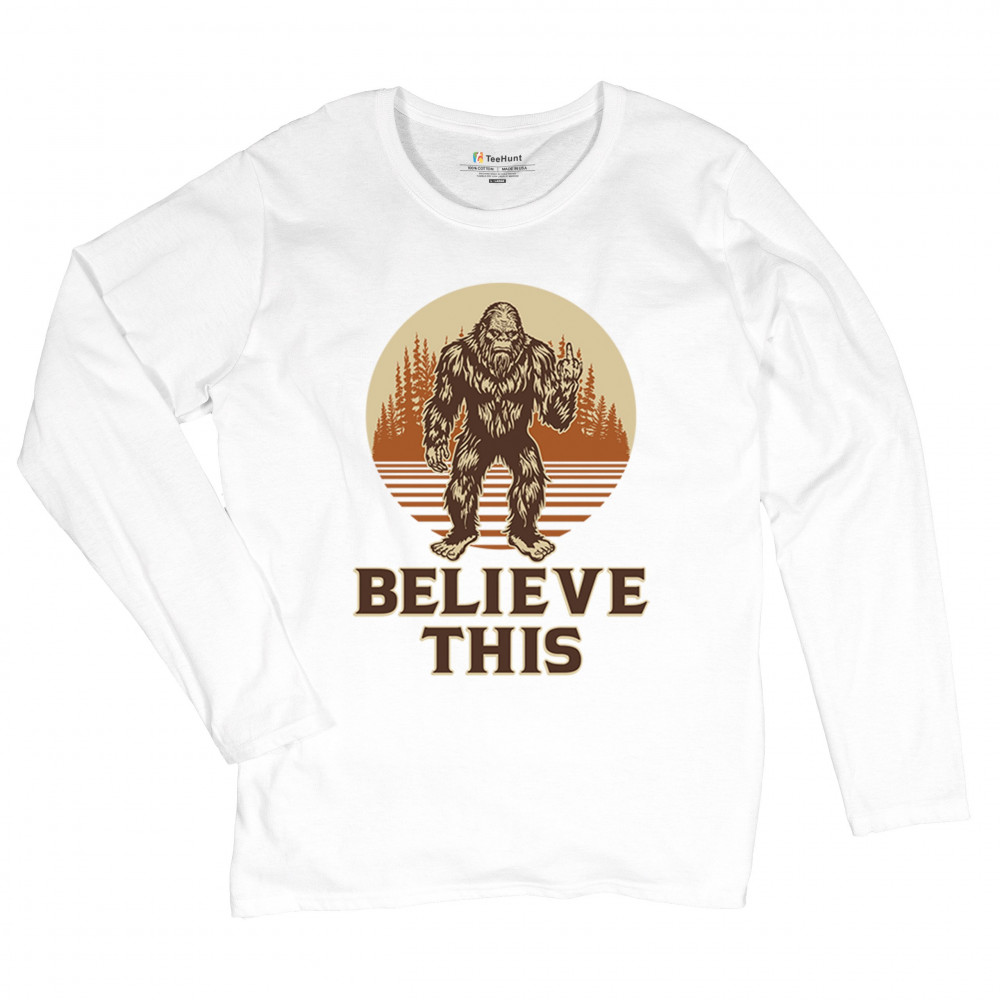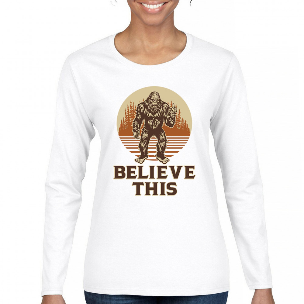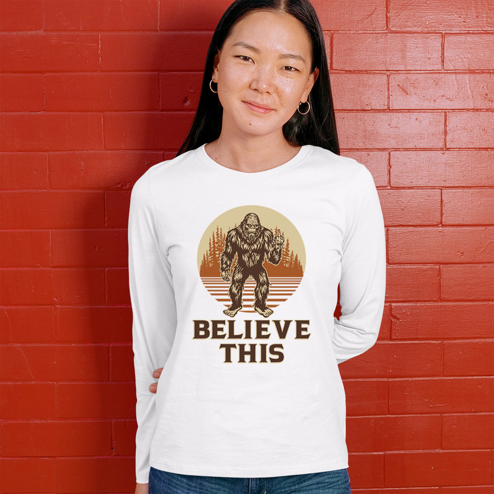 The Believe This Bigfoot design blends cryptid folklore with blunt attitude—because sometimes you just don’t care who believes. Featuring Bigfoot flipping the bird against a rustic tree line, it’s perfect for campers, rebels, and fans of sarcastic forest humor. Ideal for hikes, festivals, and off-grid living.