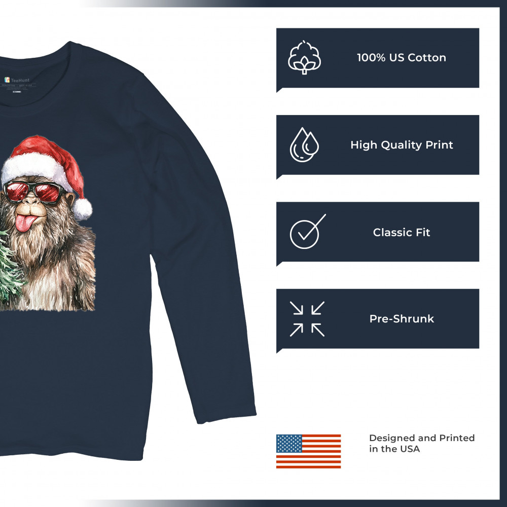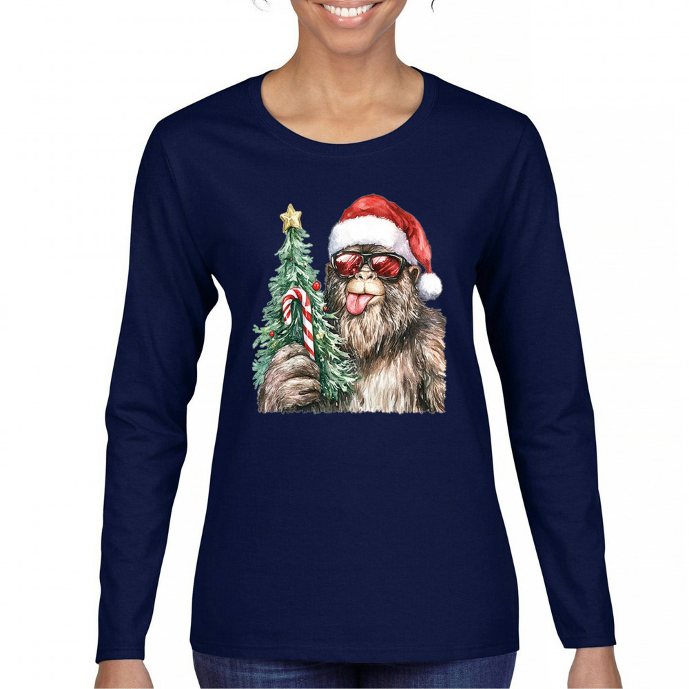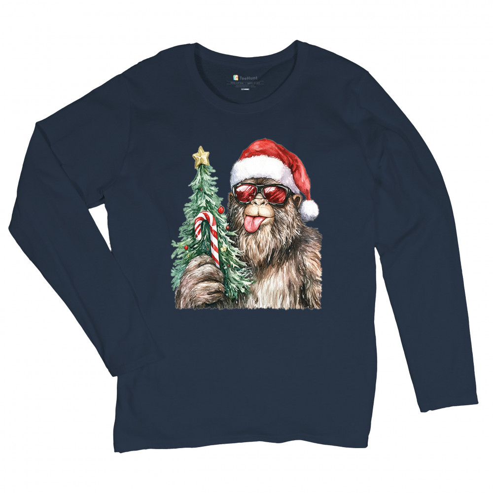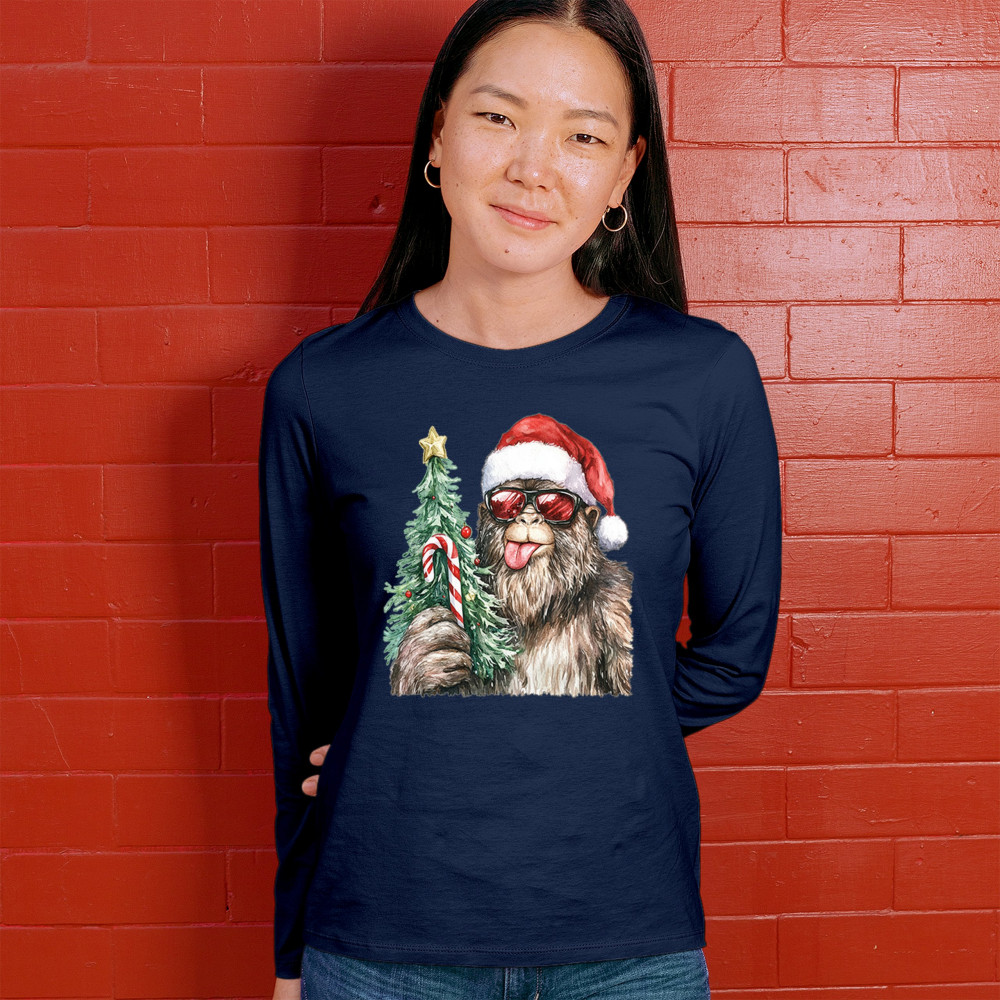 Bigfoot Christmas Santa shirt – festive Sasquatch holiday humor tee with Santa hat design, Xmas tree, candy cane, and funny Christmas style.