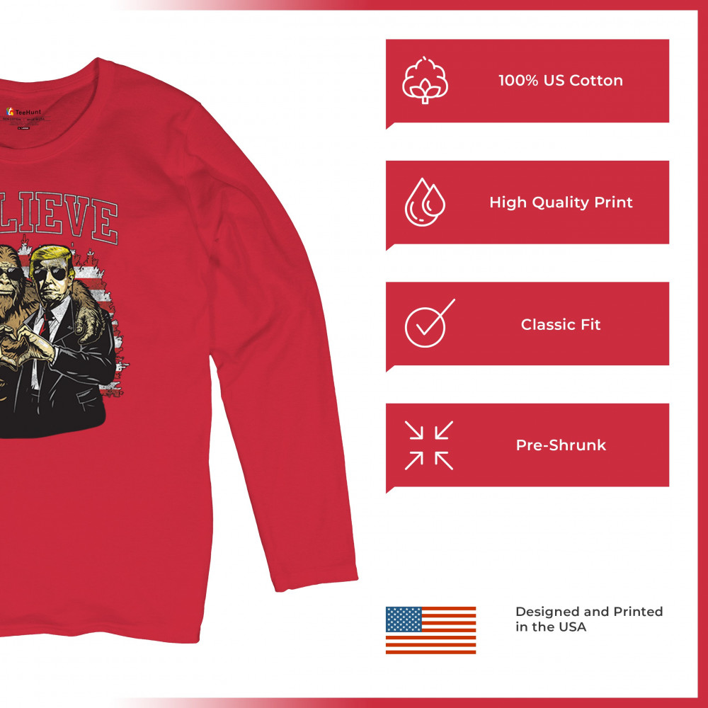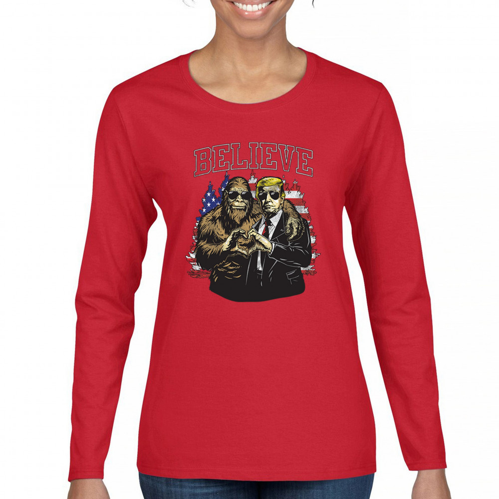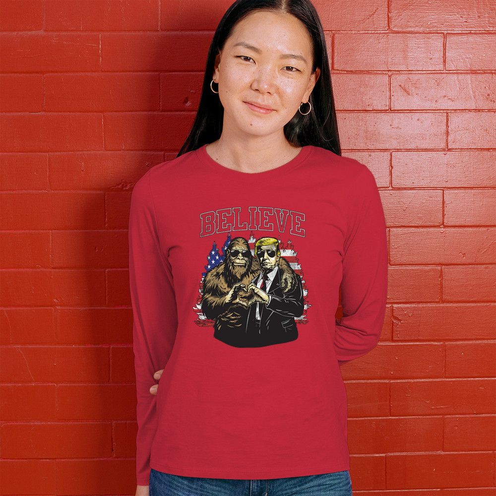 The "Believe" design combines patriotic pride and conservative values with a touch of fun. Featuring Donald J. Trump and a loyal Bigfoot against the American flag, this graphic is perfect for Trump supporters, Republicans, and believers in America First. Celebrate the Red Wave, the 47th President, and the unstoppable fight for victory. Ideal for anyone with unwavering belief in the people's mandate.