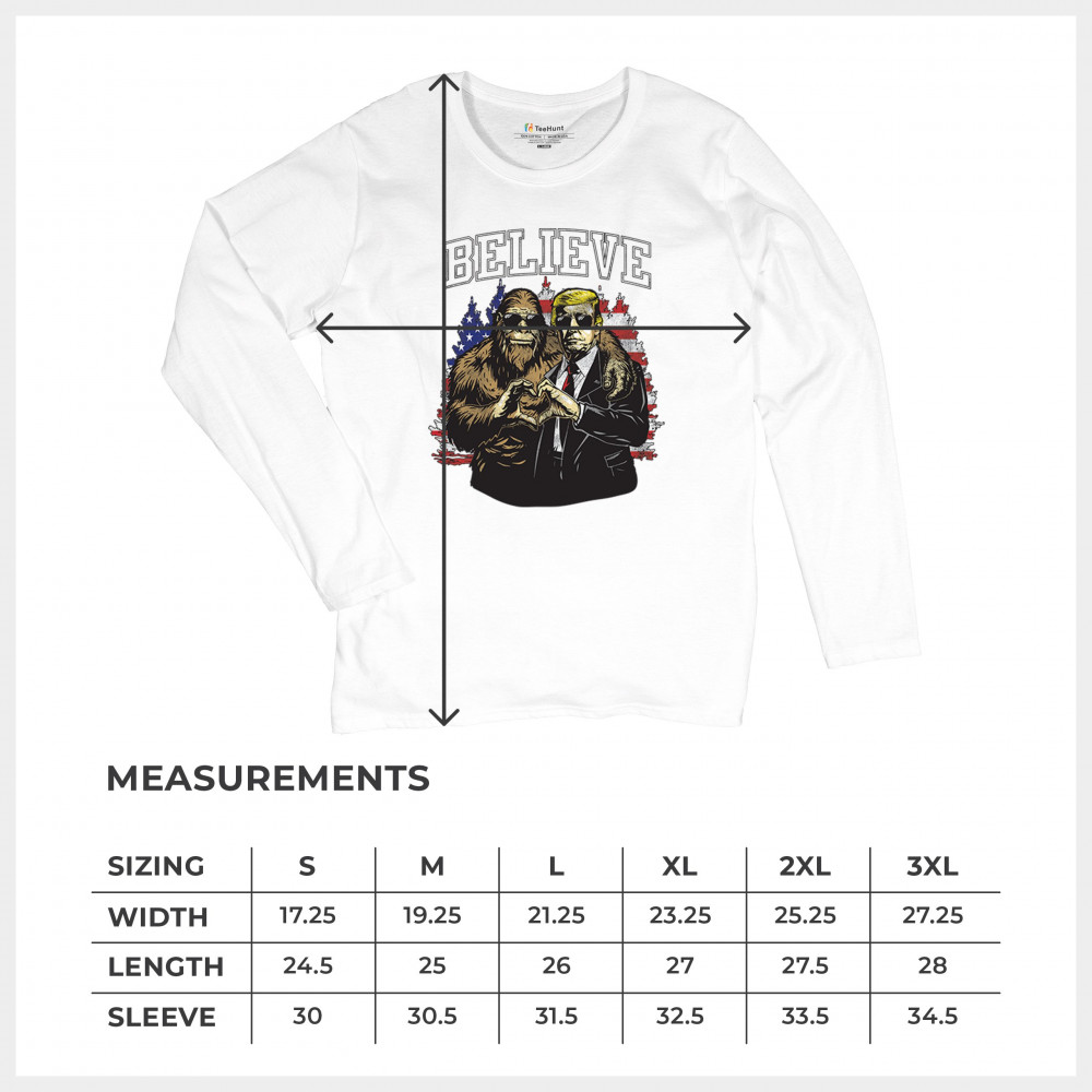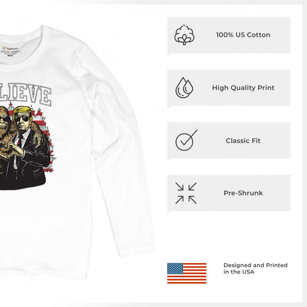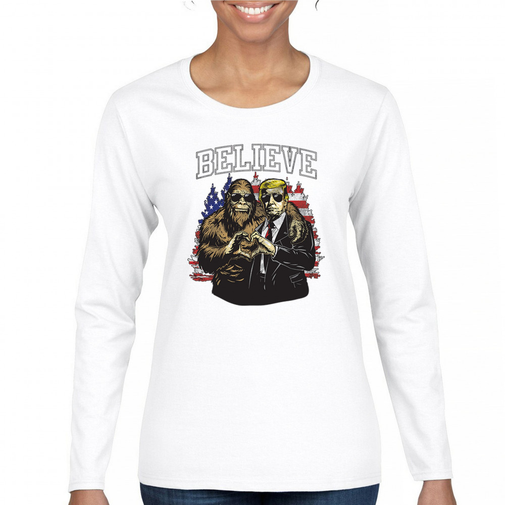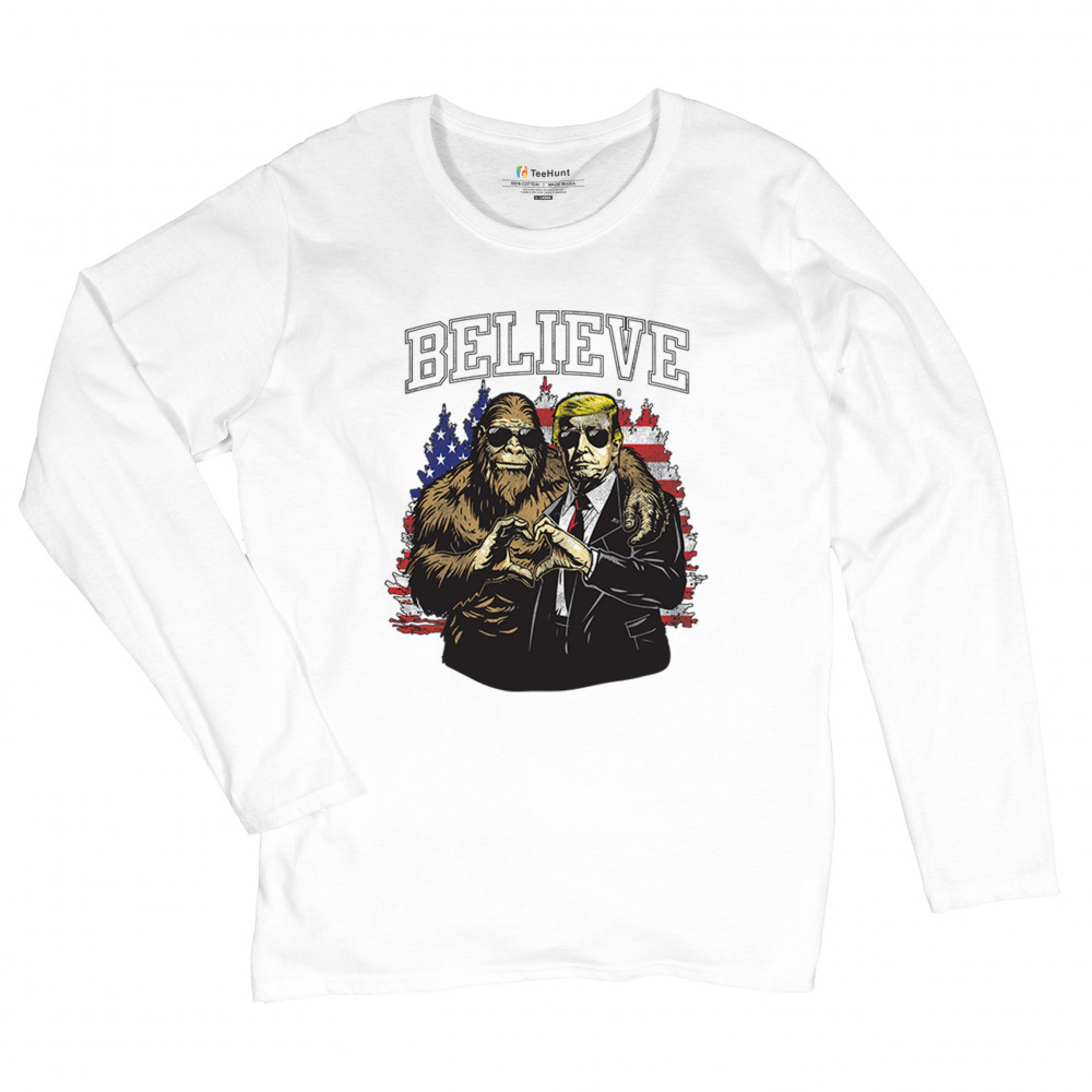 The "Believe" design combines patriotic pride and conservative values with a touch of fun. Featuring Donald J. Trump and a loyal Bigfoot against the American flag, this graphic is perfect for Trump supporters, Republicans, and believers in America First. Celebrate the Red Wave, the 47th President, and the unstoppable fight for victory. Ideal for anyone with unwavering belief in the people's mandate.