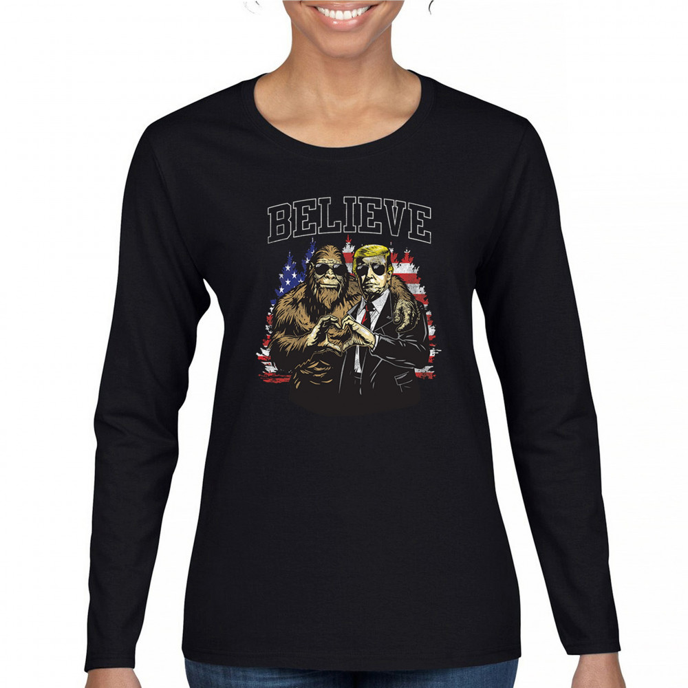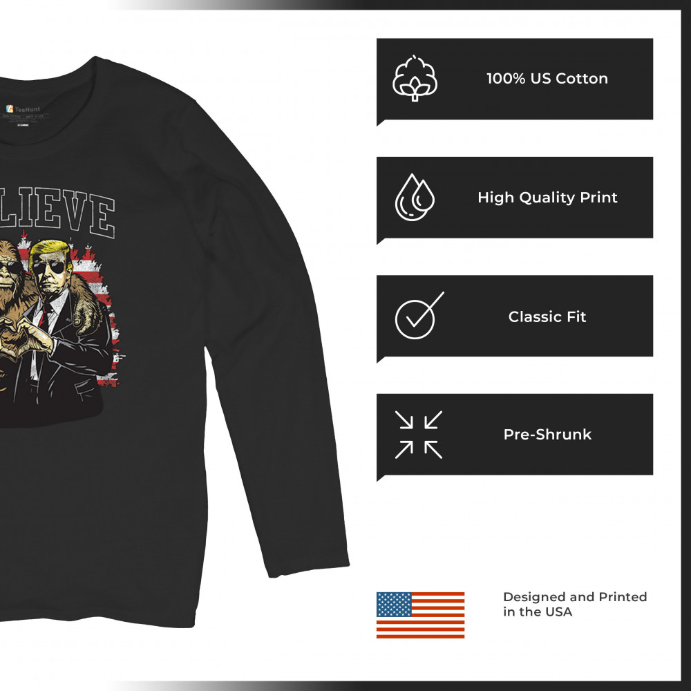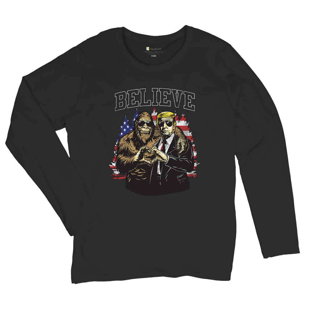 The "Believe" design combines patriotic pride and conservative values with a touch of fun. Featuring Donald J. Trump and a loyal Bigfoot against the American flag, this graphic is perfect for Trump supporters, Republicans, and believers in America First. Celebrate the Red Wave, the 47th President, and the unstoppable fight for victory. Ideal for anyone with unwavering belief in the people's mandate.